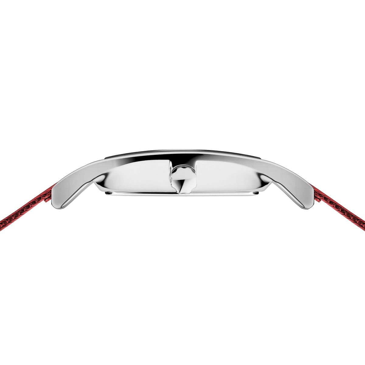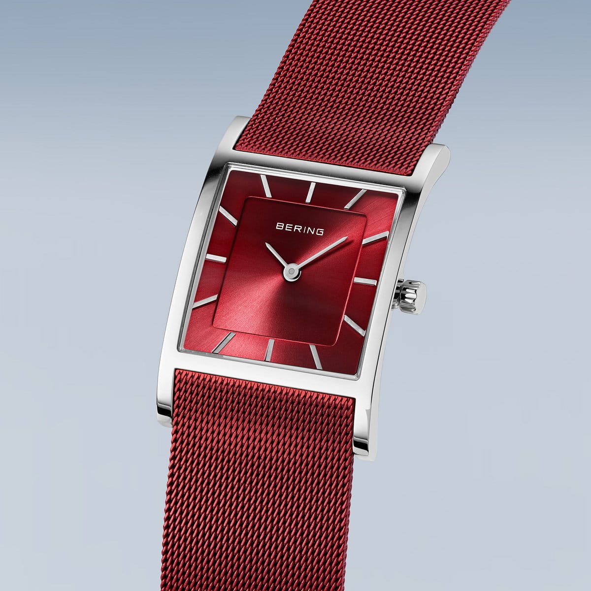 Diese Damenuhr aus der BERING Classic Kollektion verbindet geradliniges Design mit einer selbstbewussten Farbgebung. Das rechteckige Edelstahlgehäuse in glänzendem Silber rahmt ein Zifferblatt in tiefem Rot mit Sunray-Effekt, das das Licht in sanften Reflexen spielen lässt. Schlanke Indizes und feine Zeiger unterstreichen die minimalistische Eleganz.