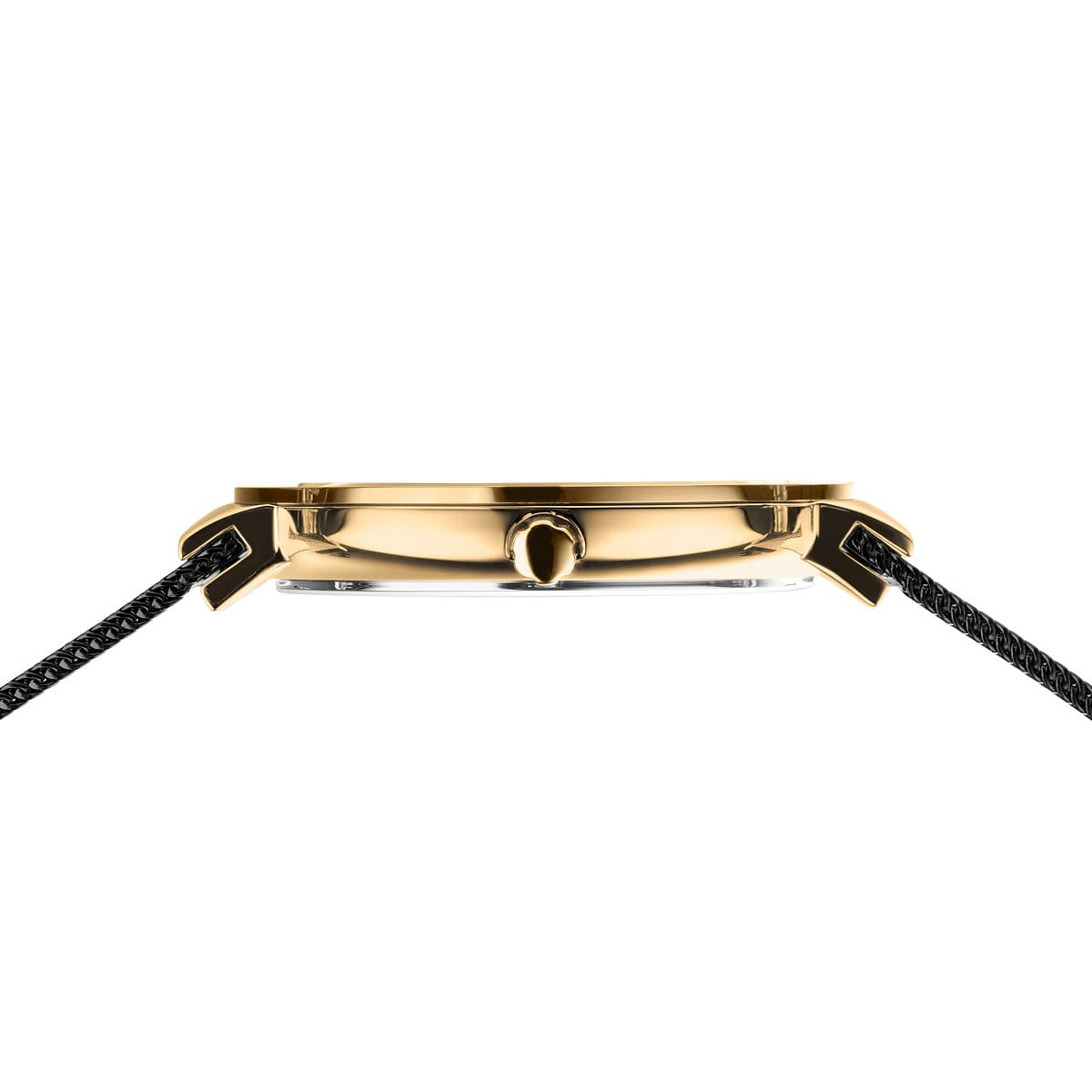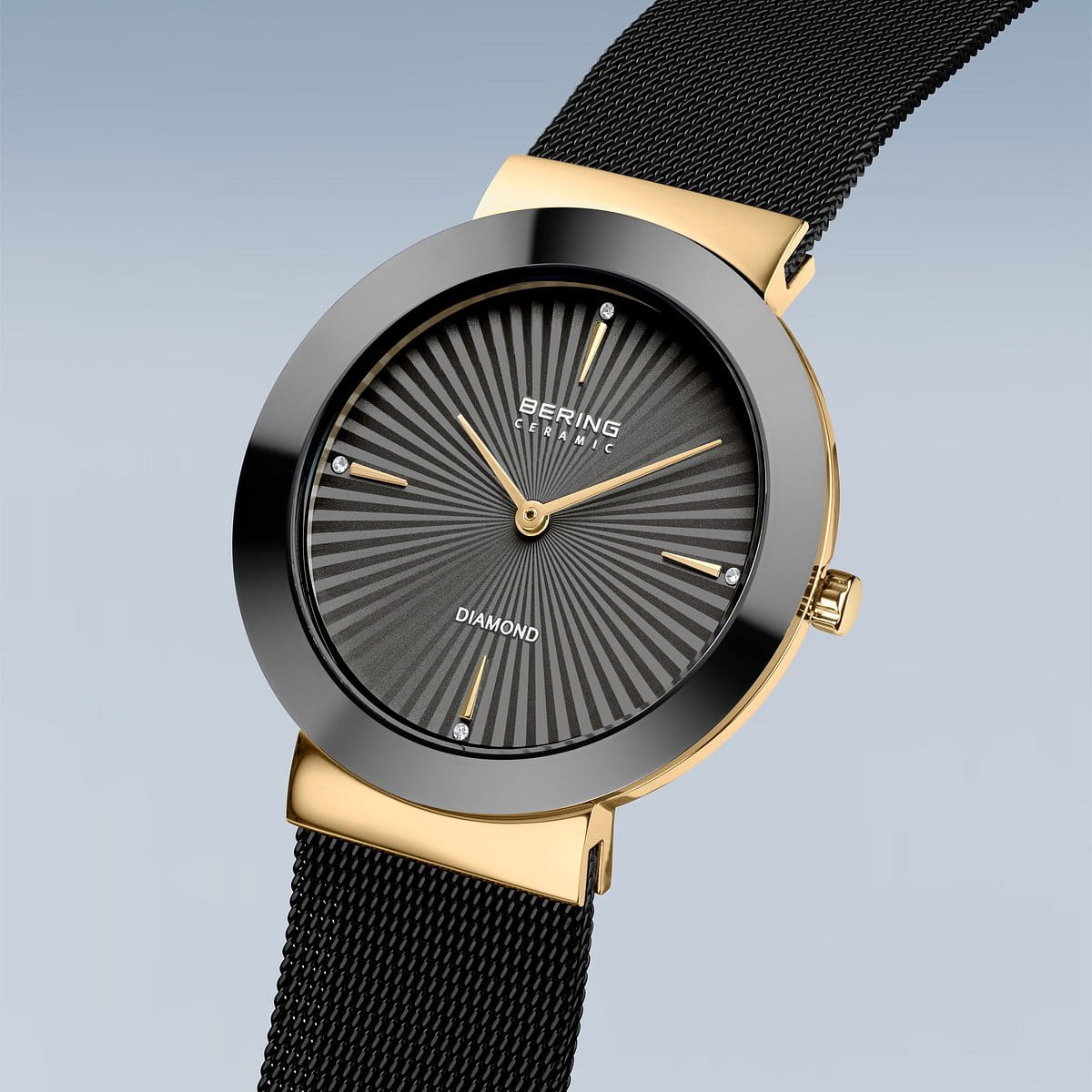 Diese luxuriöse Damenuhr vereint minimalistisches Design mit edler Materialkombination. Das glänzende Edelstahlgehäuse in goldfarbener PVD-Beschichtung wird von einer tiefschwarzen, hochglänzenden Keramiklünette eingefasst. Das feine schwarze Milanaise-Armband mit sicherem Klappverschluss fügt sich nahtlos in den eleganten Look ein und sorgt für höchsten Tragekomfort.