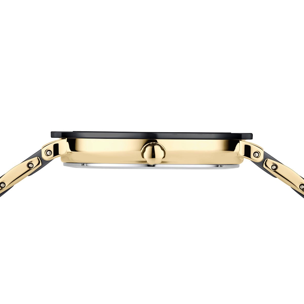 Das mehrfarbige Gliederarmband kombiniert goldfarbenen Edelstahl mit schwarzen Keramikelementen – eine Verbindung aus kühler Stärke und warmer Eleganz. Die Butterfly-Schließe sorgt für einen nahtlosen Übergang und sicheren Sitz. Trotz ihrer ausdrucksstarken Optik bleibt die Uhr dezent: Mit nur 6 mm Höhe und einem Durchmesser von 35 mm trägt sie sich angenehm schlank und feminin. Flaches Saphirglas schützt das kunstvoll strukturierte Zifferblatt dauerhaft vor Kratzern.
