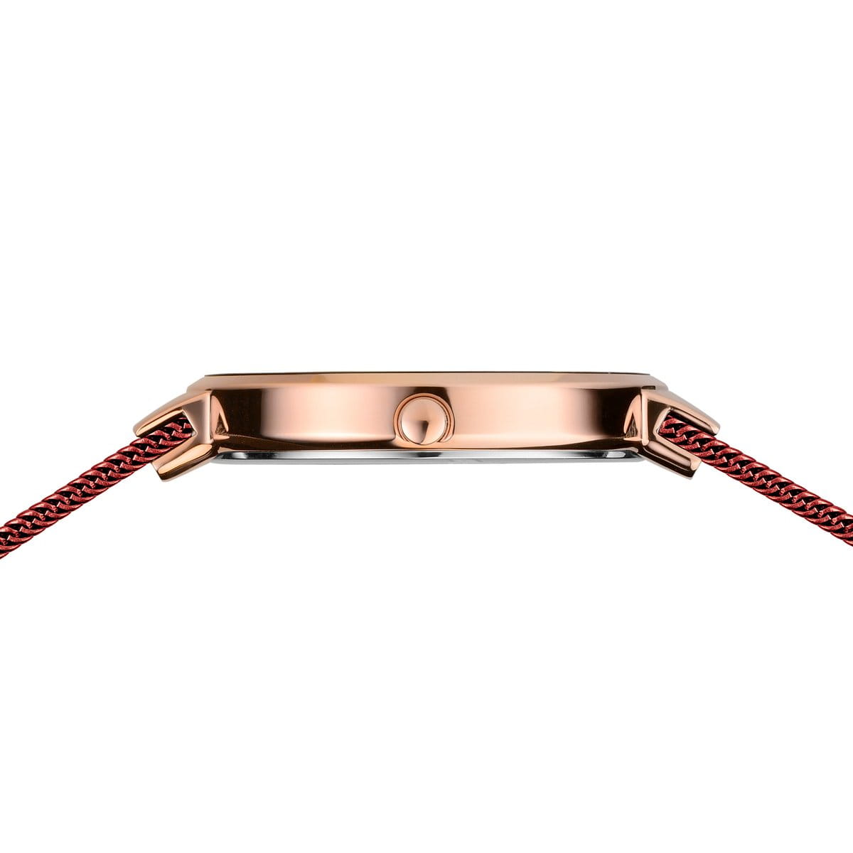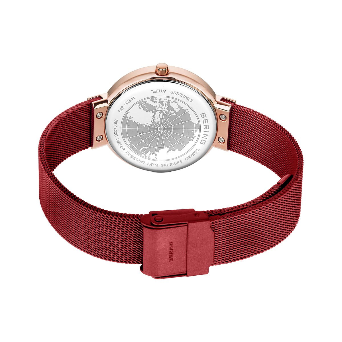 Das gebürstete, roségoldfarbene Edelstahl-Gehäuse, gefertigt aus reinem und hochwertigem Edelstahl (316L), wie er auch in der Medizintechnik Verwendung findet, in Kombination mit dem modernen Milanaiseband in der Farbe Rot sorgt für einen Hingucker unter den klassischen BERING-Looks. Zusätzlich verleiht das feingliedrig gearbeitete Milanaiseband der Uhr einen edlen, beinahe vornehmen Touch. Ein farblich passend zum Armband minimalstisches und mit kristallklarem und kratzfestem Saphirglas geschütztes Sunray-Zifferblatt rundet den Look perfekt ab.
