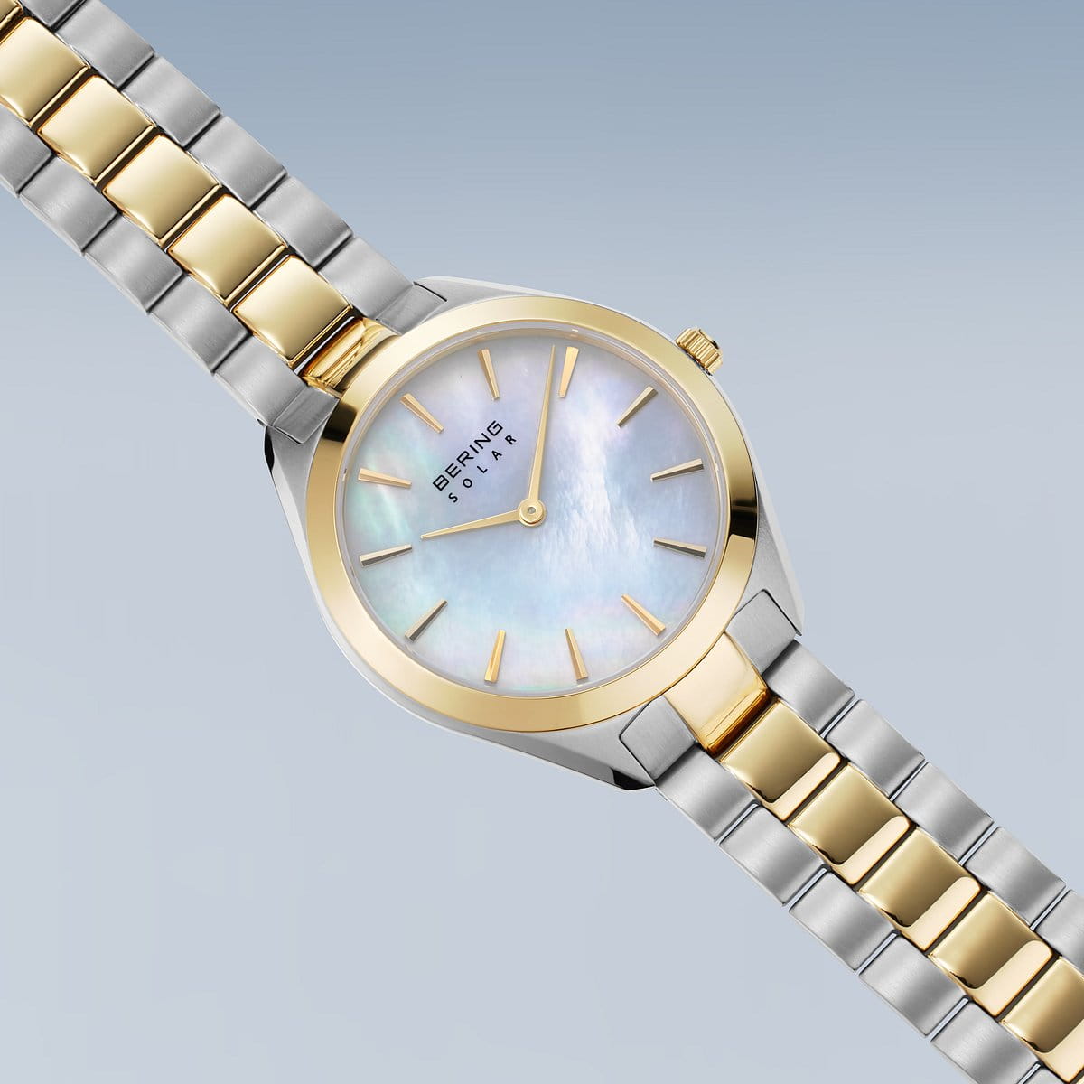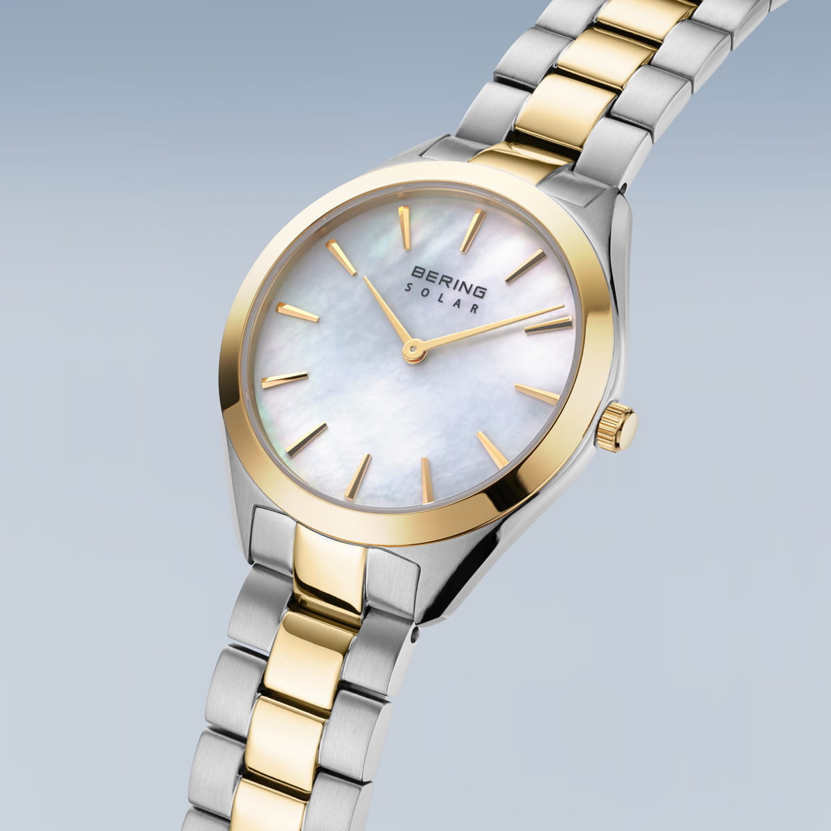 Diese Damenuhr aus der BERING Solar Kollektion verbindet zeitloses Design mit moderner Technologie. Das Zifferblatt aus echtem Perlmutt schimmert in feinen Nuancen und erinnert an die arktische Klarheit des Himmels. Schlanke, goldfarbene Indizes und Zeiger bringen Wärme in das Design und schaffen einen edlen Kontrast zur Kühle des Materials.
