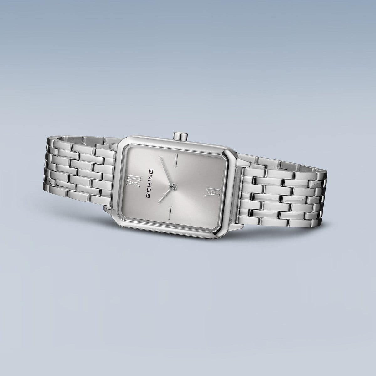 Diese BERING Damenuhr verbindet klassische Formen mit einer zeitgemäßen Eleganz. Ihr rechteckiges Gehäuse aus glänzendem Edelstahl wirkt durch die klaren Konturen und das schlanke Profil von nur 6 mm besonders modern und leicht. Das silberfarbene Zifferblatt mit Sunray-Effekt fängt das Licht bei jeder Bewegung ein und verleiht der Uhr eine subtile Tiefe – dezent betont durch römische Ziffern auf 12 und 6 Uhr.