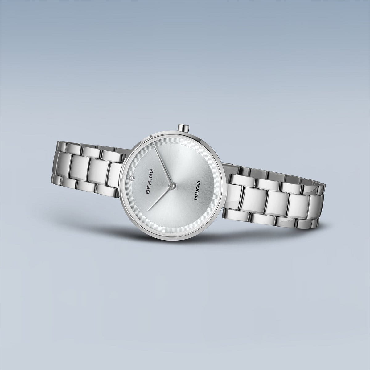 Diese Damenuhr aus der BERING Classic Kollektion verbindet modernes Design mit luxuriösen Details. Das runde Edelstahlgehäuse in poliertem Gold (30 mm Breite, 29 mm Länge, 2 mm Höhe) fasst ein silbernes Zifferblatt, das mit einem echten Diamanten bei 12 Uhr veredelt ist. Flaches, kratzfestes Saphirglas schützt das Zifferblatt zuverlässig.