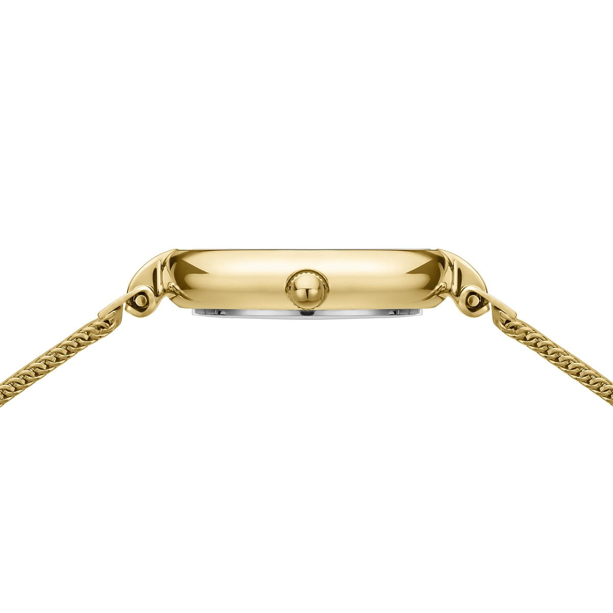 Ein Milanaise-Armband in warmem Goldton ergänzt das minimalistische Design durch feine Struktur und hohen Tragekomfort. Es legt sich geschmeidig ums Handgelenk und wird sicher mit einem eleganten Klappverschluss geschlossen. Kratzfestes, flaches Saphirglas schützt das Zifferblatt dauerhaft – auch im hektischen Alltag bleibt der Blick auf das Wesentliche stets klar.