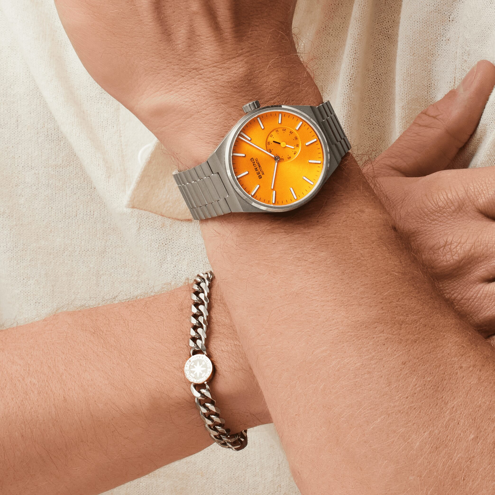 Das mattierte Gehäuse aus Edelstahl mit ovaler Silhouette betont die maskuline Klarheit der Form. Im Zentrum steht das auffällig orangefarbene Sunray-Zifferblatt – ein seltener Blickfang, der bei jeder Bewegung lebendig spielt und an das warme Leuchten der tiefstehenden arktischen Sonne erinnert. Die kleine Sekunde bei 6 Uhr schafft zusätzliche Dynamik und verleiht der Uhr eine technisch-inspirierte Tiefe.