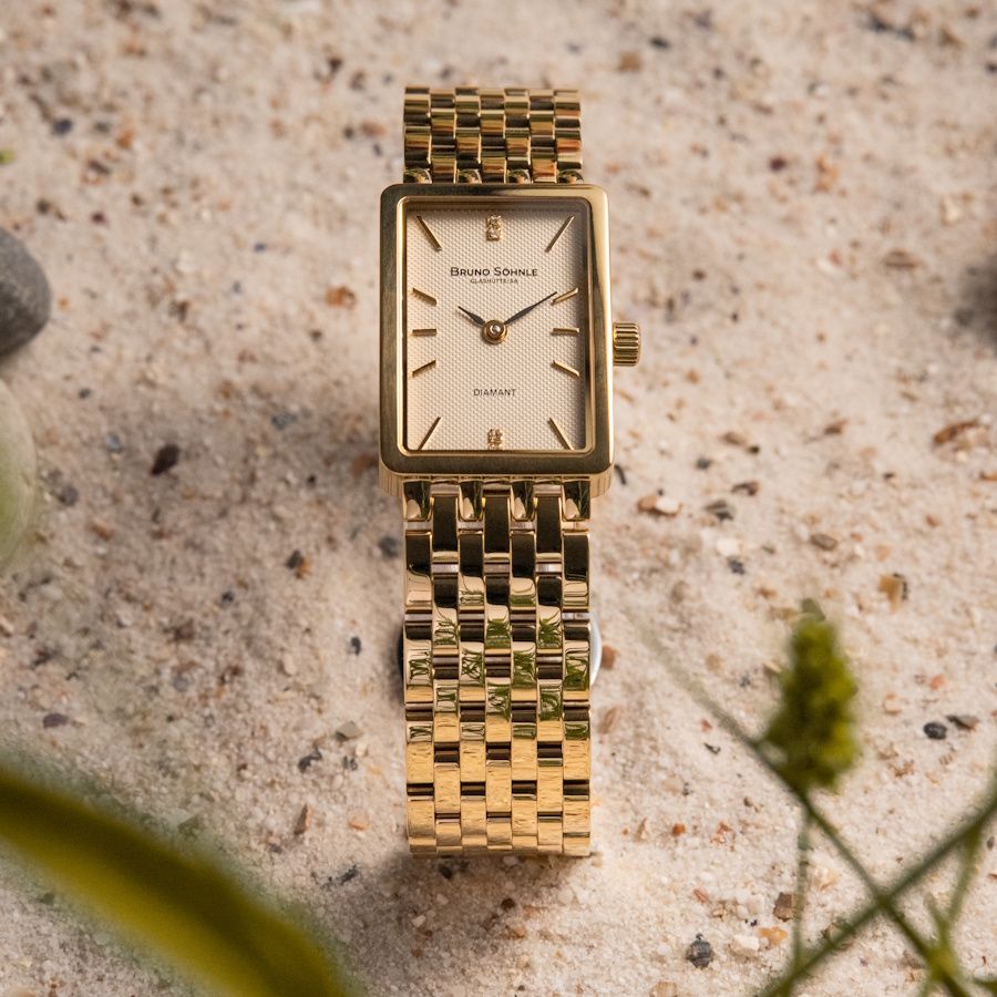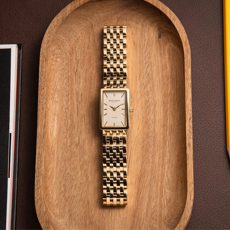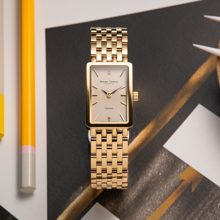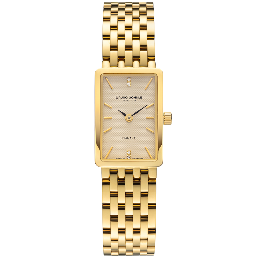 Quarzwerk in veredelter Bruno Söhnle Ausführung (Basiswerk Ronda 1062), Edelstahl IP Gold, 30 x 20 mm, Höhe 6,0 mm, 3 bar, Saphirglas innen entspiegelt, integriertes Edelstahlarmband mit IP Gold Beschichtung, Doppelfaltschließe, 4 Brillanten.