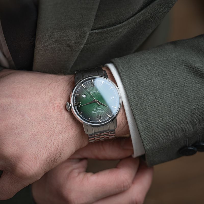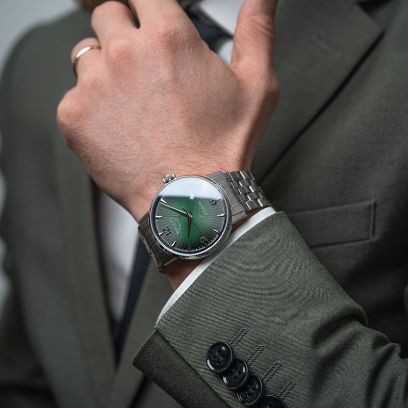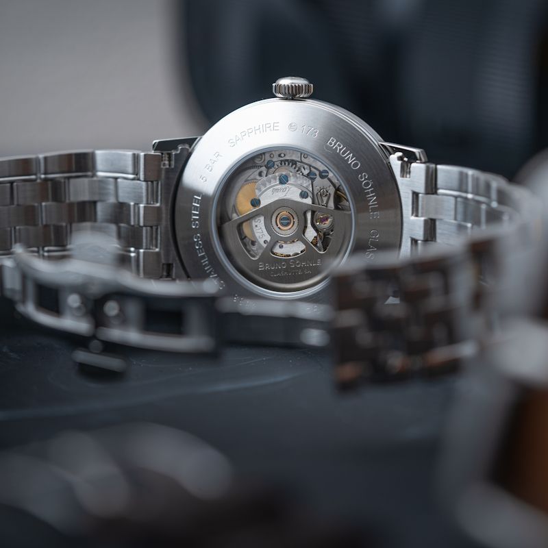 Atelierkaliber BS175 (Basiswerk Sellita SW200-1), Edelstahl, Ø 42 mm, Höhe 10,8 mm, 10 bar, Saphirglas innen entspiegelt, feingliedriges Edelstahlarmband mit massiven Gliedern, Faltschließe mit Sicherheitsbügel.