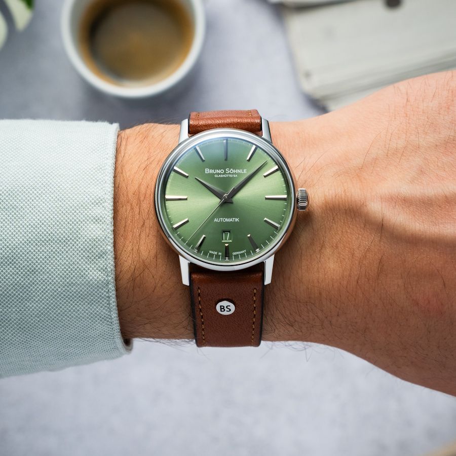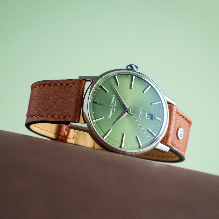 Das grüne Zifferblatt mit Sonnenschliff fängt das Licht ein und verändert sich je nach Blickwinkel – ein lebendiges Detail, das die Uhr zu einem echten Hingucker macht. Zwölf aufgesetzte, polierte Indexe und das Datum auf 6 Uhr schaffen ein ausgewogenes Gesamtbild. Abgerundet wird das Design durch ein cognacfarbenes Bio-Lederband, das Wärme und Natürlichkeit ausstrahlt.