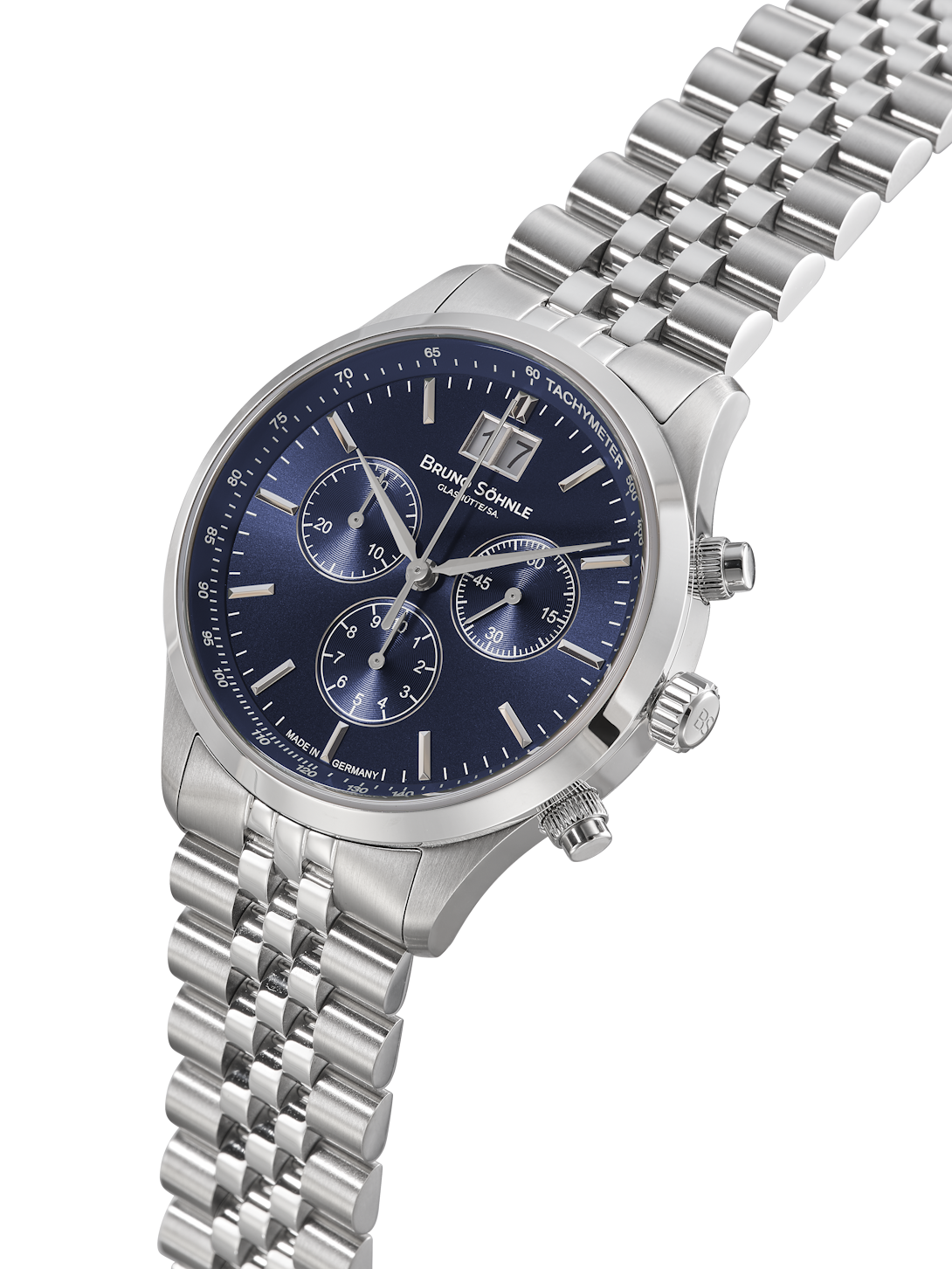 Quarzwerk in veredelter Bruno Söhnle Ausführung(Basiswerk Ronda 5040.B), Edelstahl, Ø 39,5 mm, Höhe 12,0 mm, 10 bar, Saphirglas innen entspiegelt, Edelstahlarmband mit massiven Gliedern, Faltschließe mit Sicherheitsbügel.