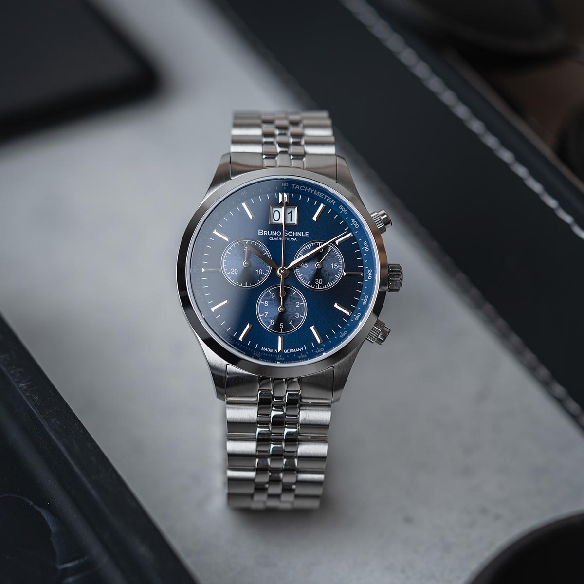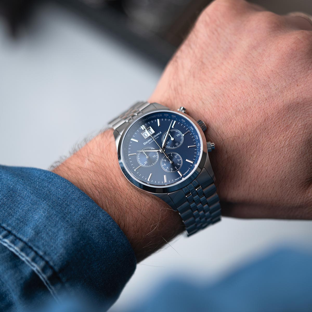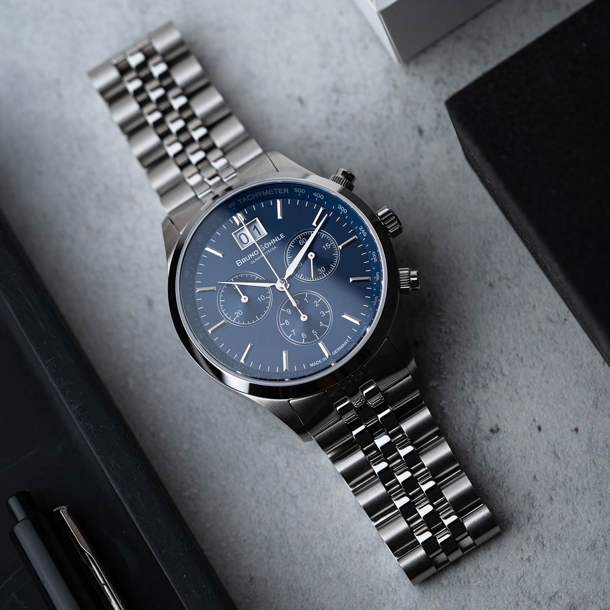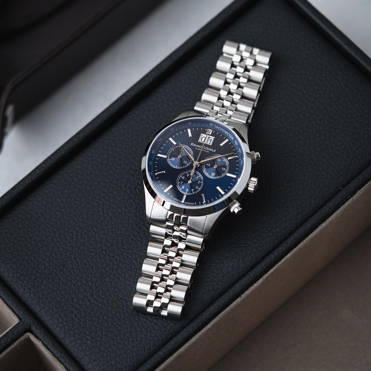 Der Turin Chronograph, ähnlich der Turin II Big, präsentiert sich mit einem fünfgliedrigen Edelstahlarmband. Im Unterschied zu einem herkömmlichen 3-Zeiger Uhrwerk ist hier ein Chronographenwerk verbaut, welches zusätzlich mit einem Großdatum ausgestattet ist. Ganz im Stil von Bruno Söhnle ist das veredelte Quarzwerk durch einen Boden aus gehärtetem Mineralglas sichtbar. Das Zifferblatt, mit einem ansprechenden Sonnenschliff, erstrahlt in einem dunklen Blauton.