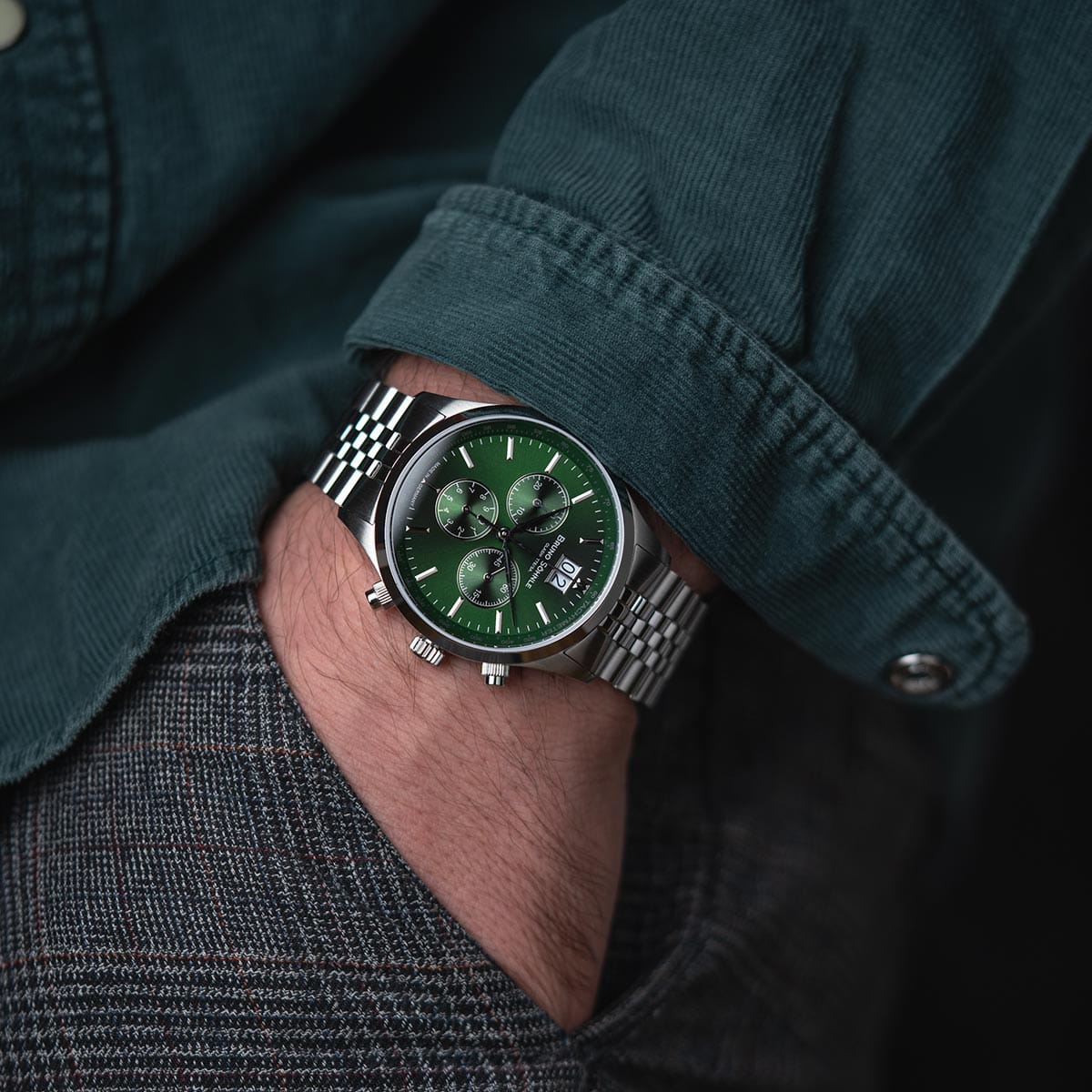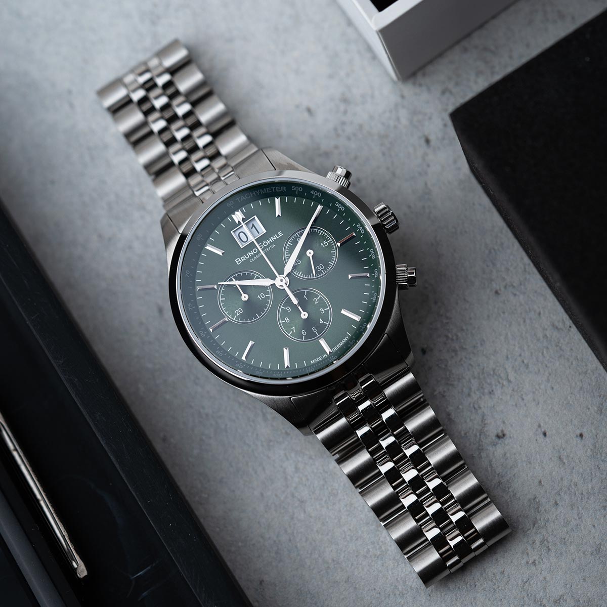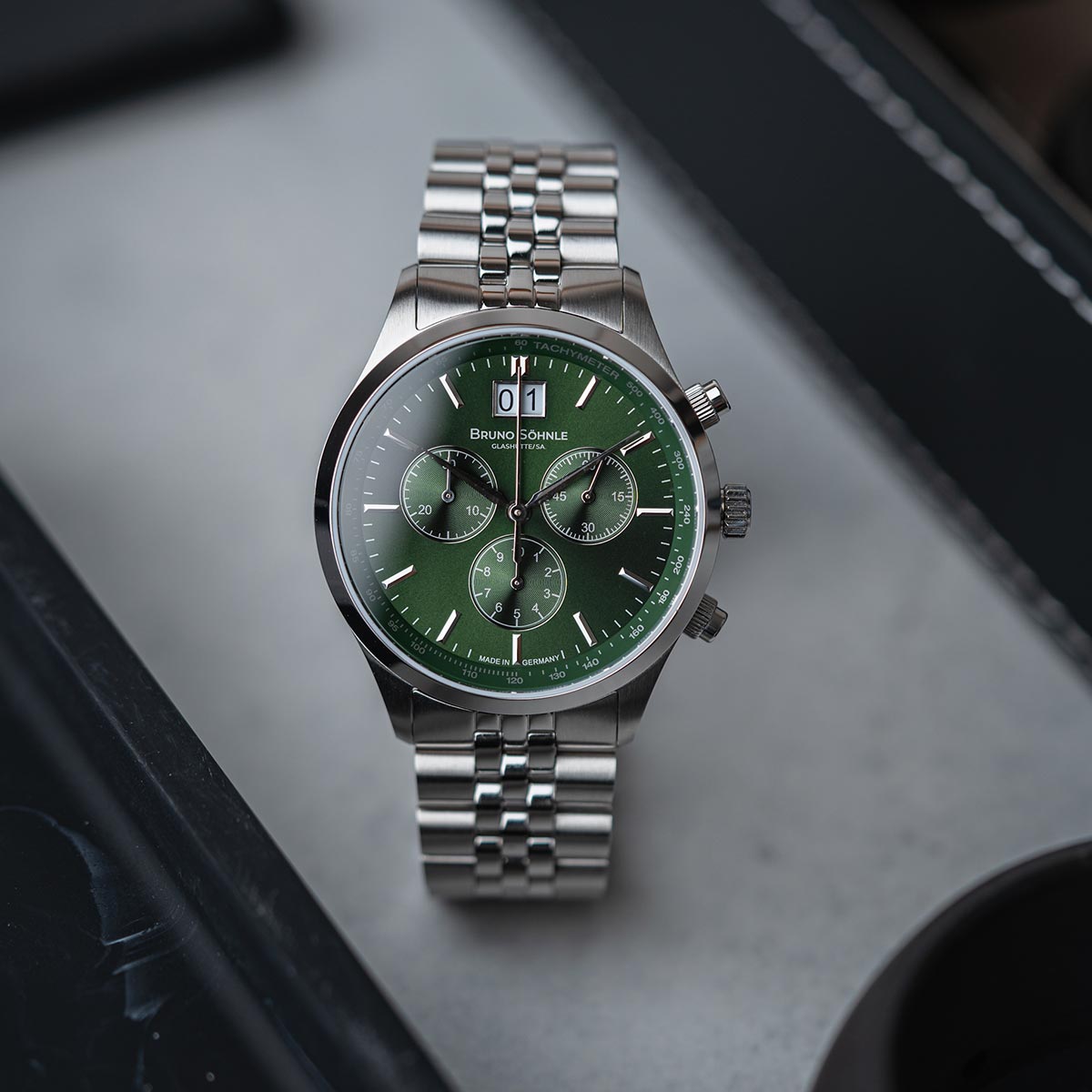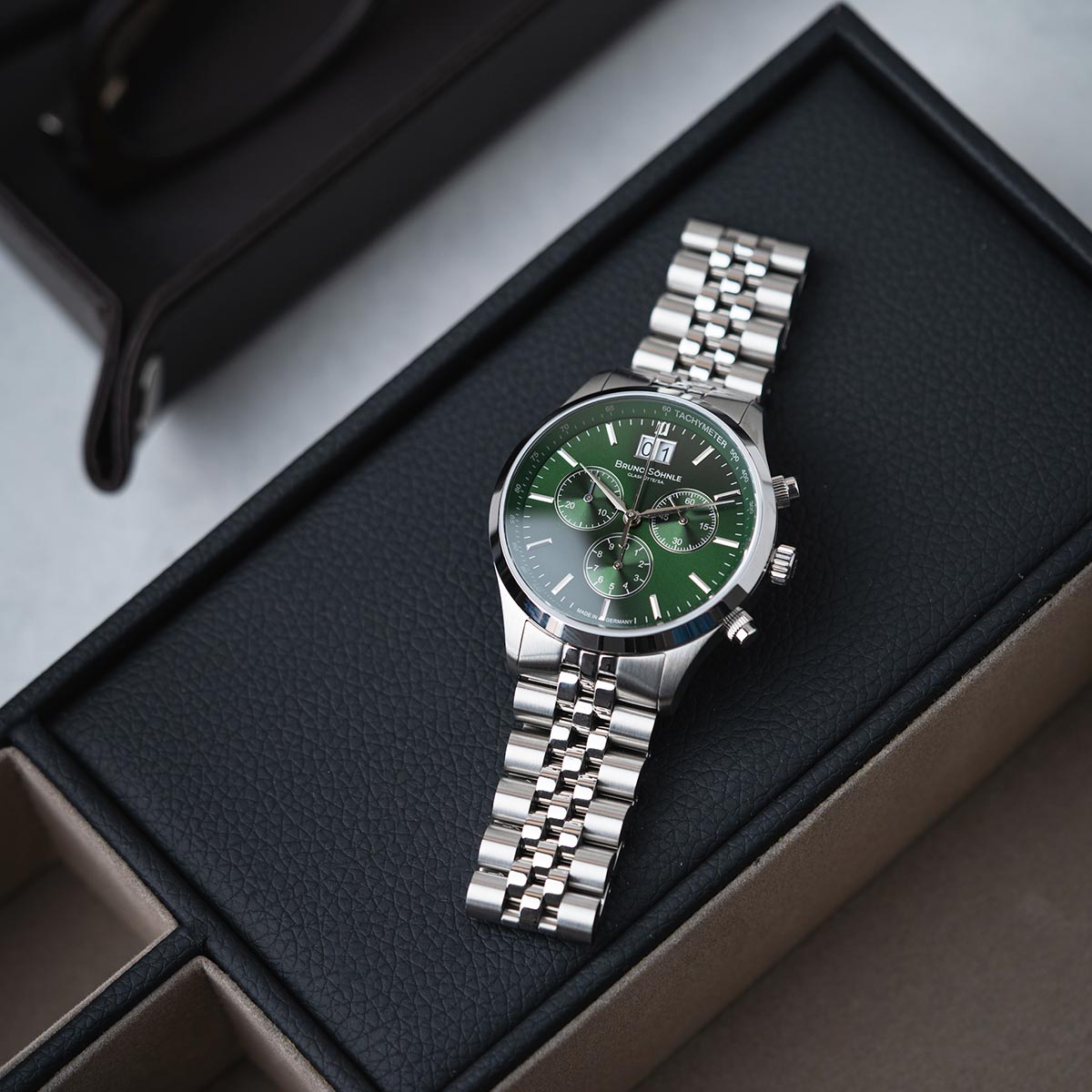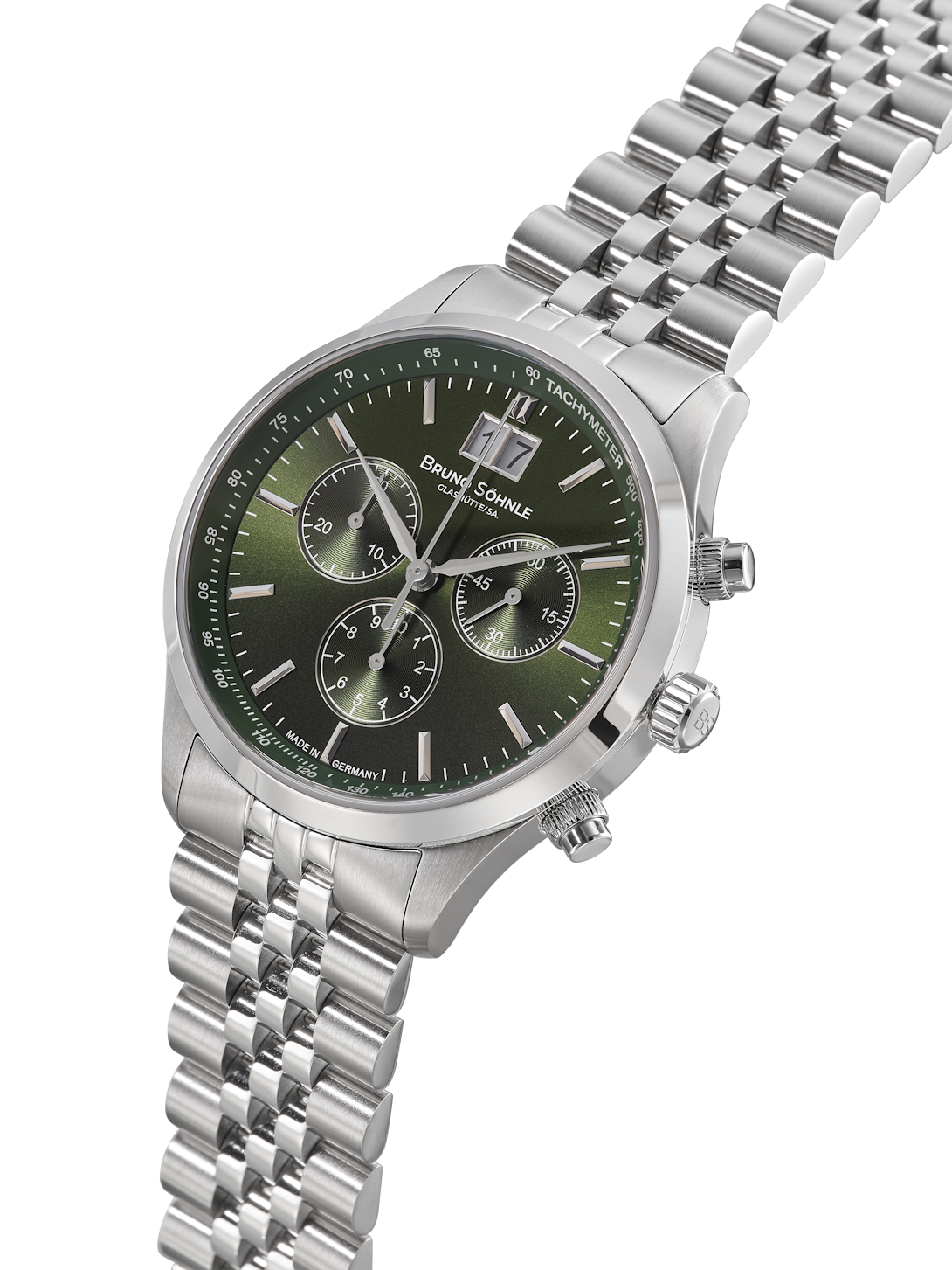 Der Turin Chronograph, ähnlich der Turin II Big, präsentiert sich mit einem fünfgliedrigen Edelstahlarmband. Im Unterschied zu einem herkömmlichen 3-Zeiger Uhrwerk ist hier ein Chronographenwerk verbaut, welches zusätzlich mit einem Großdatum ausgestattet ist. Ganz im Stil von Bruno Söhnle ist das veredelte Quarzwerk durch einen Boden aus gehärtetem Mineralglas sichtbar. Das Zifferblatt, mit einem ansprechenden Sonnenschliff, erstrahlt in einem dunklen Grünton.
