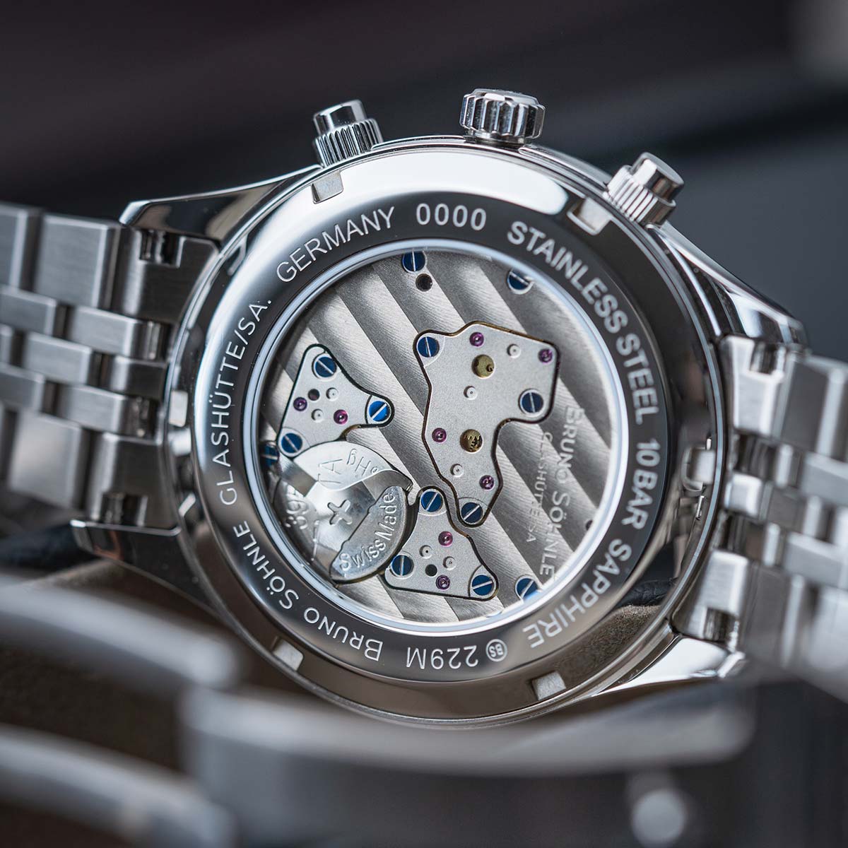 Quarzwerk in veredelter Bruno Söhnle Ausführung(Basiswerk Ronda 5040.B), Edelstahl, Ø 39,5 mm, Höhe 12,0 mm, 10 bar, Saphirglas innen entspiegelt, Edelstahlarmband mit massiven Gliedern, Faltschließe mit Sicherheitsbügel.