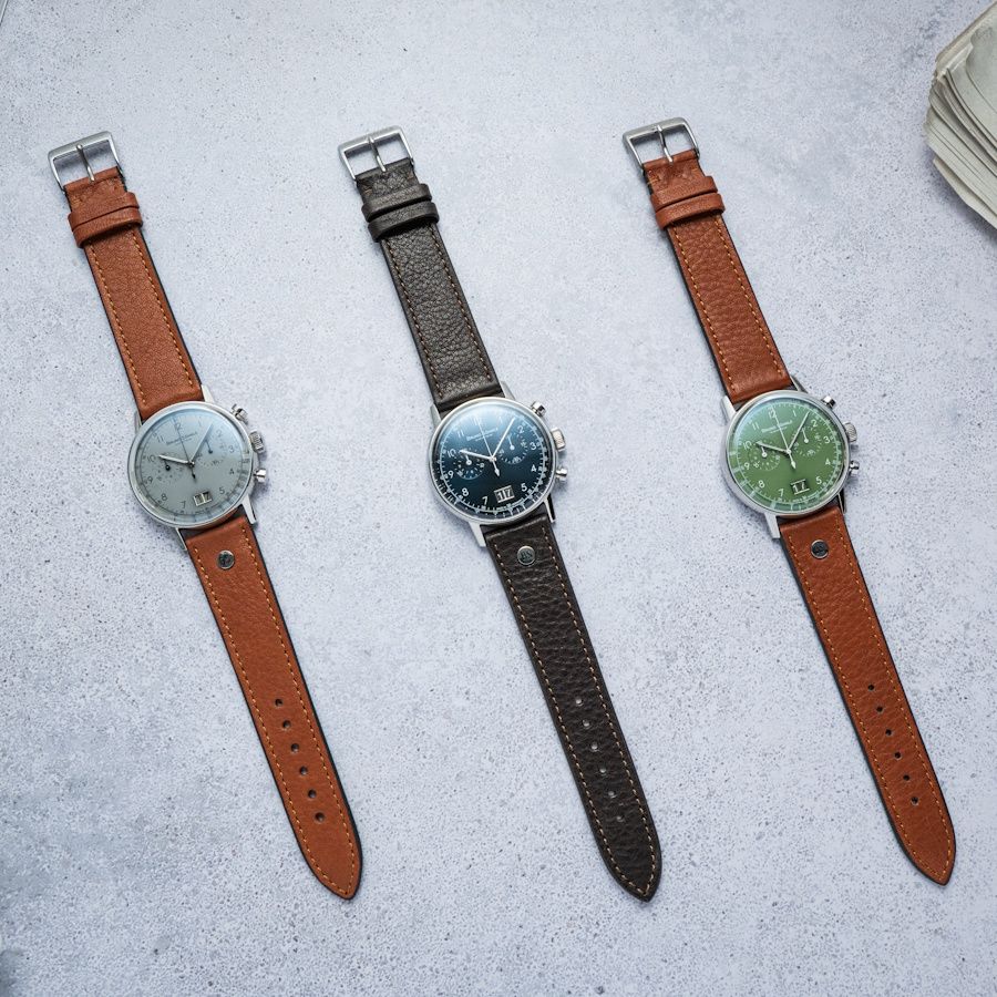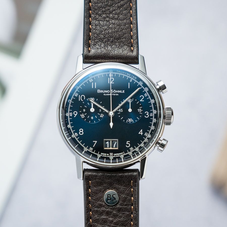 Das dunkelblaue Zifferblatt mit Sonnenschliff harmoniert mit den weißen arabischen Ziffern, während das symmetrisch platzierte Großdatum bei 6 Uhr und die fein polierten Stabzeiger für ein aufgeräumtes Bild sorgen, das trotz Komplexität klar und edel wirkt. Ein mokkafarbenes Bio-Lederband ergänzt den Look mit natürlicher Eleganz.