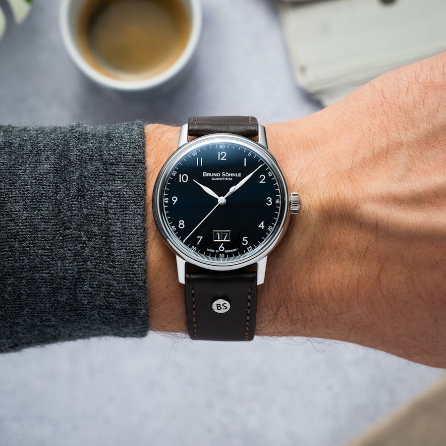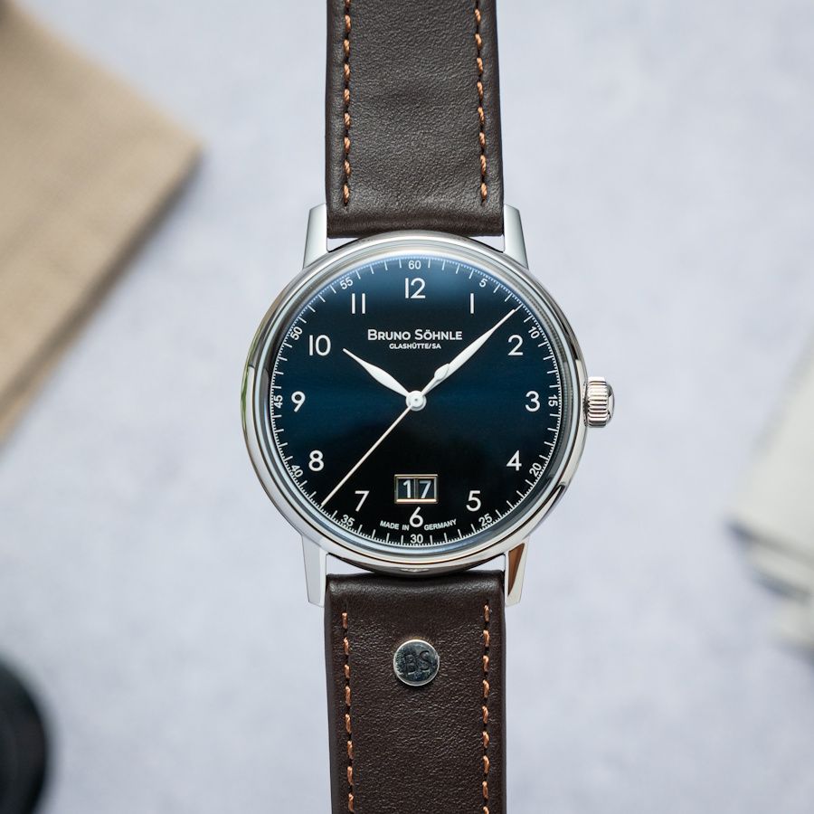 Das dunkelblaue Sonnenschliff-Zifferblatt mit weißen arabischen Ziffern wirkt dynamisch und zugleich elegant. Das Großdatum bei 6 Uhr verleiht Symmetrie und Alltagstauglichkeit. Getragen am dunkelbraunen Echtlederband, ergibt sich ein souveräner Auftritt, der Business wie Freizeit gleichermaßen unterstreicht.