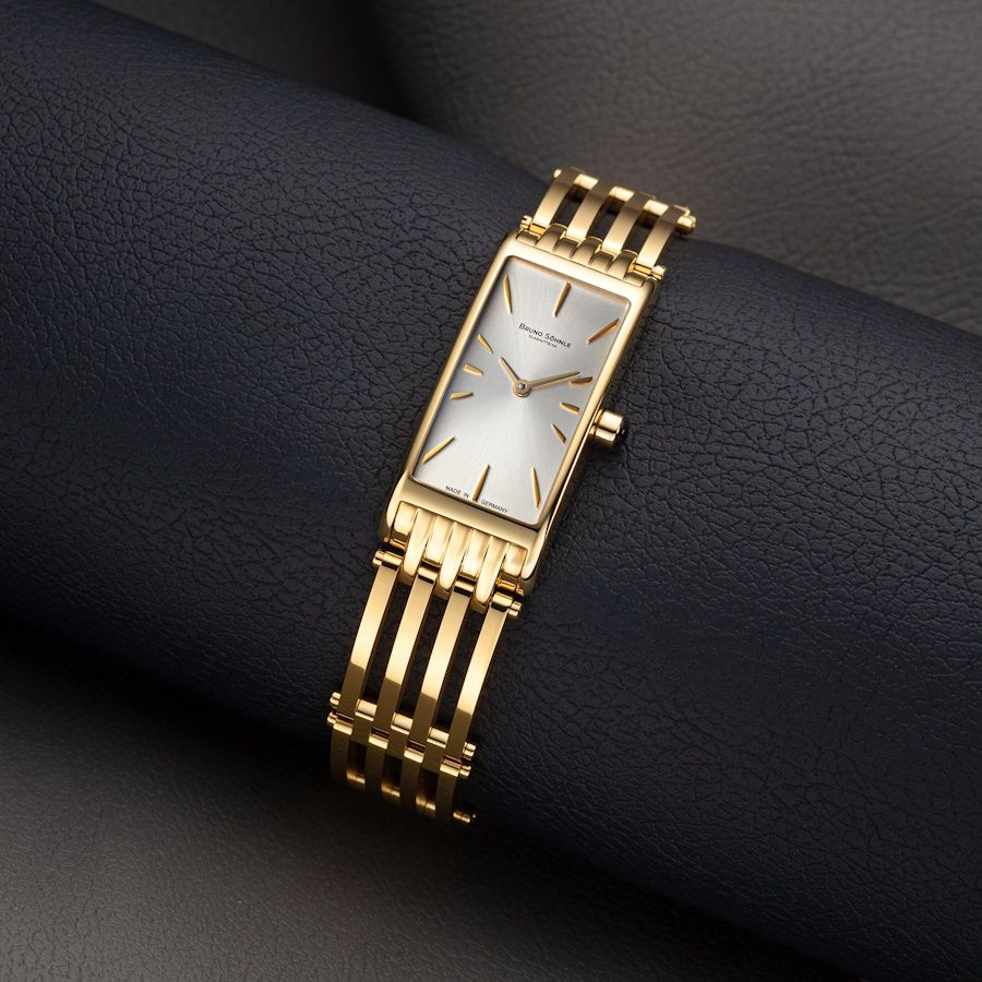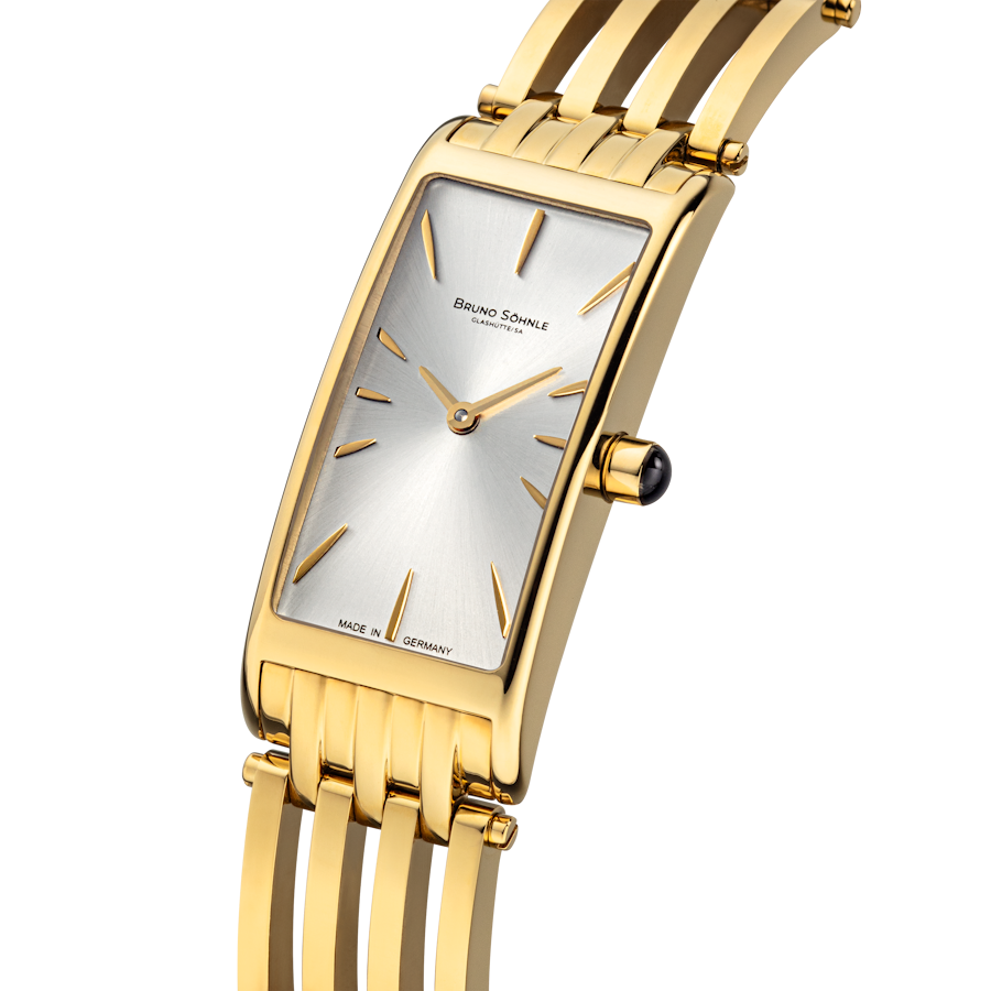 Quarzwerk in veredelter Bruno Söhnle Ausführung (Basiswerk Ronda 751), Gehäuse Edelstahl IP gold, Zifferblatt silber, Maße 17,0 mm x 38,0 mm, Höhe 7,1 mm, 3 bar, Saphirglas innen entspiegelt, Metallband Edelstahl IP gold, Faltschließe.