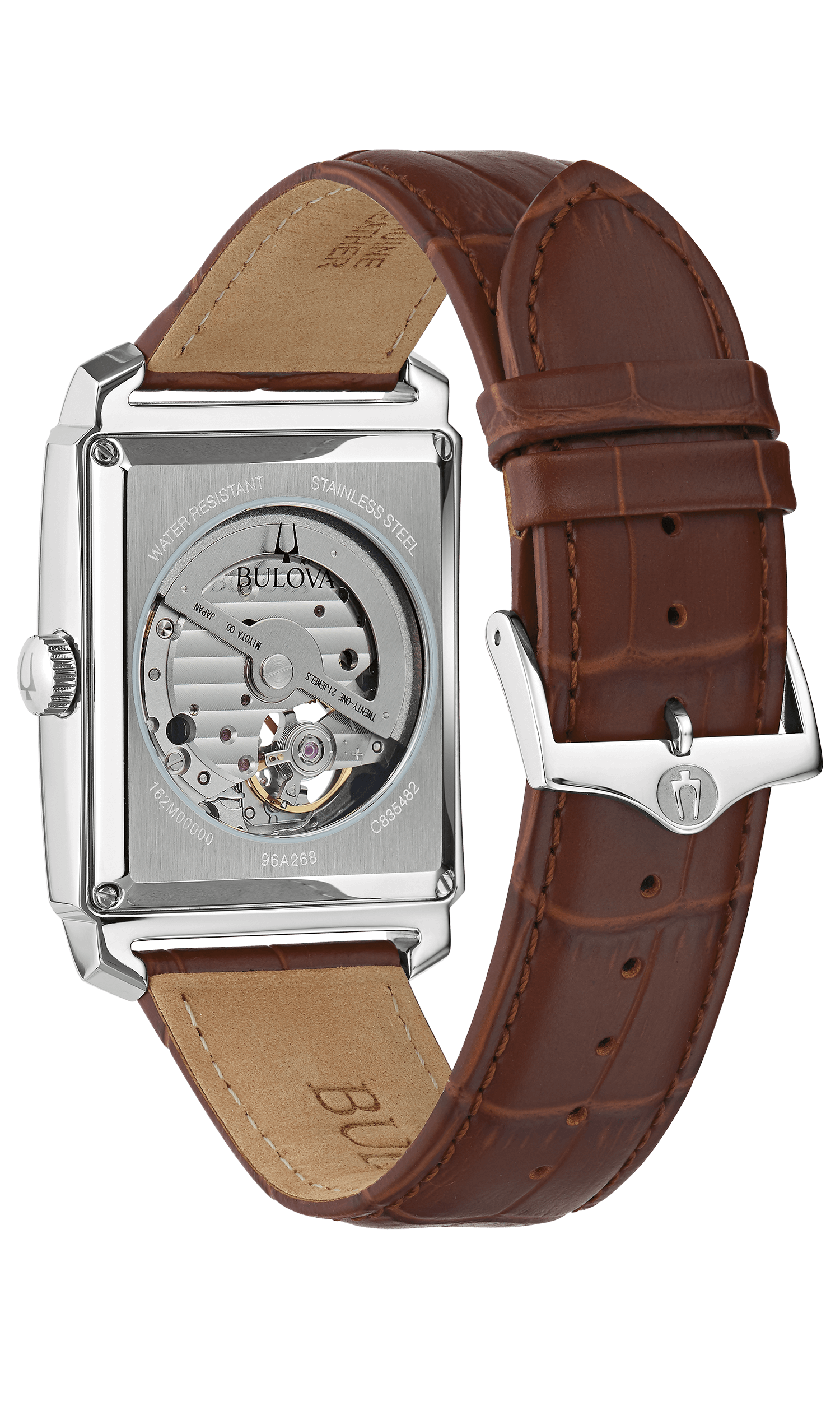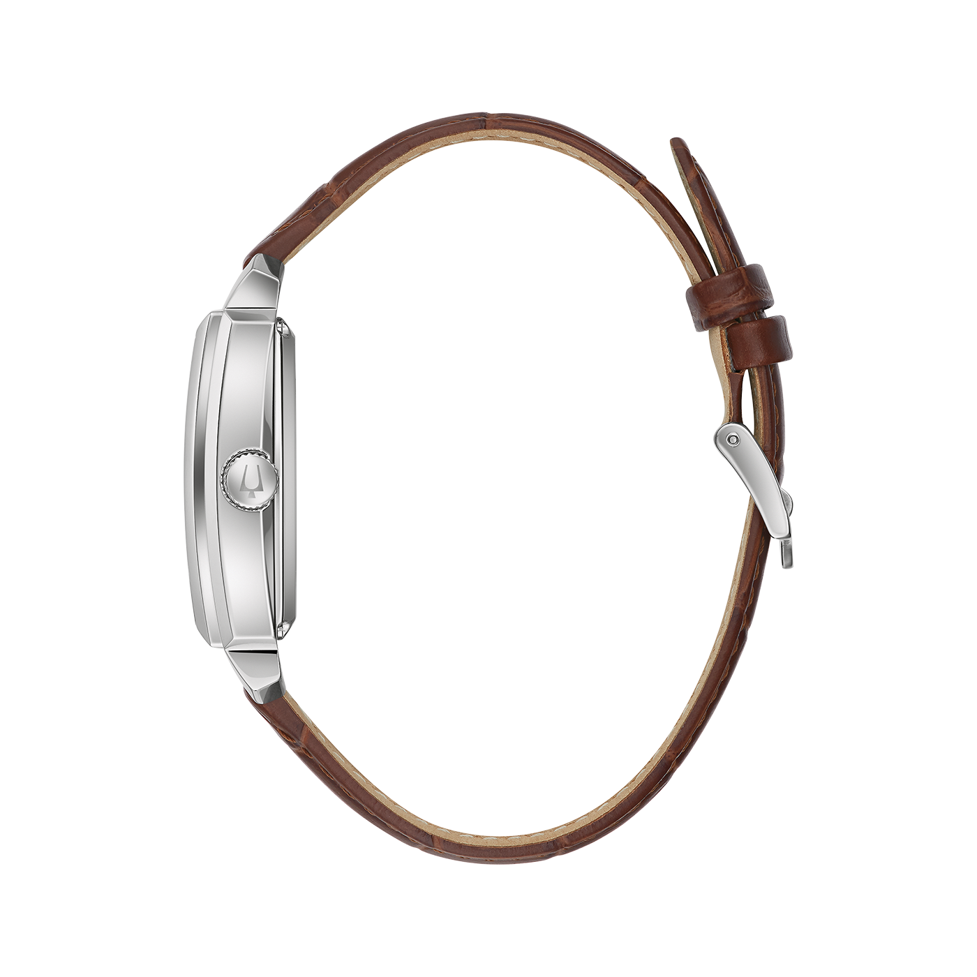 Die neue Sutton Automatic von Bulova verleiht dieser klassischen Uhr eine frische neue Form. Inspiriert vom President-Stil von 1948 verfügt das rechteckige Edelstahlgehäuse über ein silberweißes Zifferblatt mit roségoldfarbenen Akzenten, eine dezente Textur und eine offene Öffnung für den Blick auf die Unruh des Uhrwerks. Auf der Gehäuserückseite befindet sich ein Sichtfenster aus Mineralglas, das den Blick auf das Automatikwerk dieser Luxusuhr freigibt. Für einen eleganten Stil sorgt das Gehäuse mit einem satten braunen Lederarmband mit Alligatornarbung.
