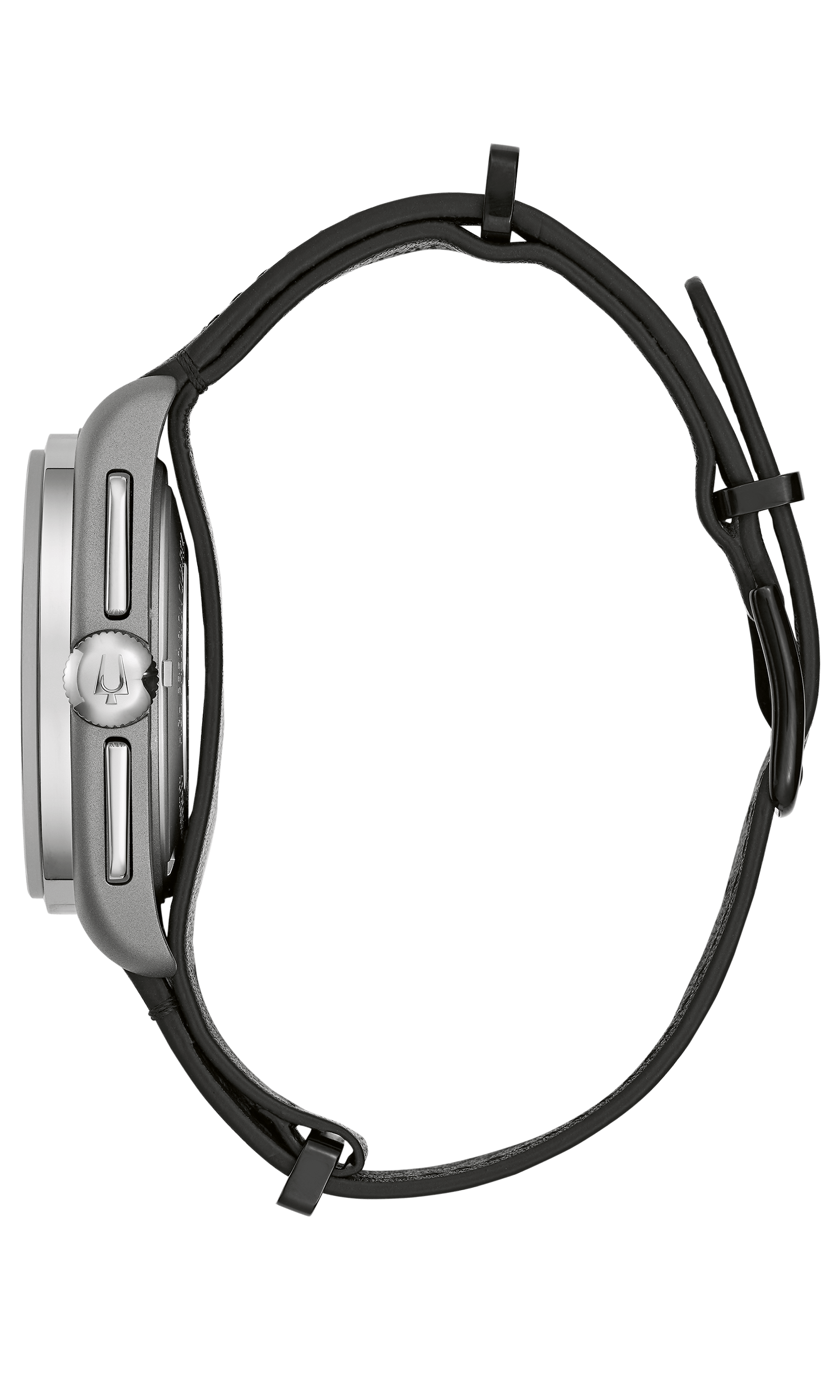 Angetrieben wird die Uhr von Bulovas proprietärem Hochpräzisions-Quarzwerk mit einer Frequenz von 262 kHz, das außergewöhnliche Genauigkeit und einen dynamischen Chronographenzeiger bietet. Das graue Zifferblatt zeigt Stunden-, Minuten- und Sekundenzeiger sowie eine Datumsanzeige und verfügt über eine Stoppuhrfunktion (max. 12 Stunden, Minuten, 1/20 Sekunde).