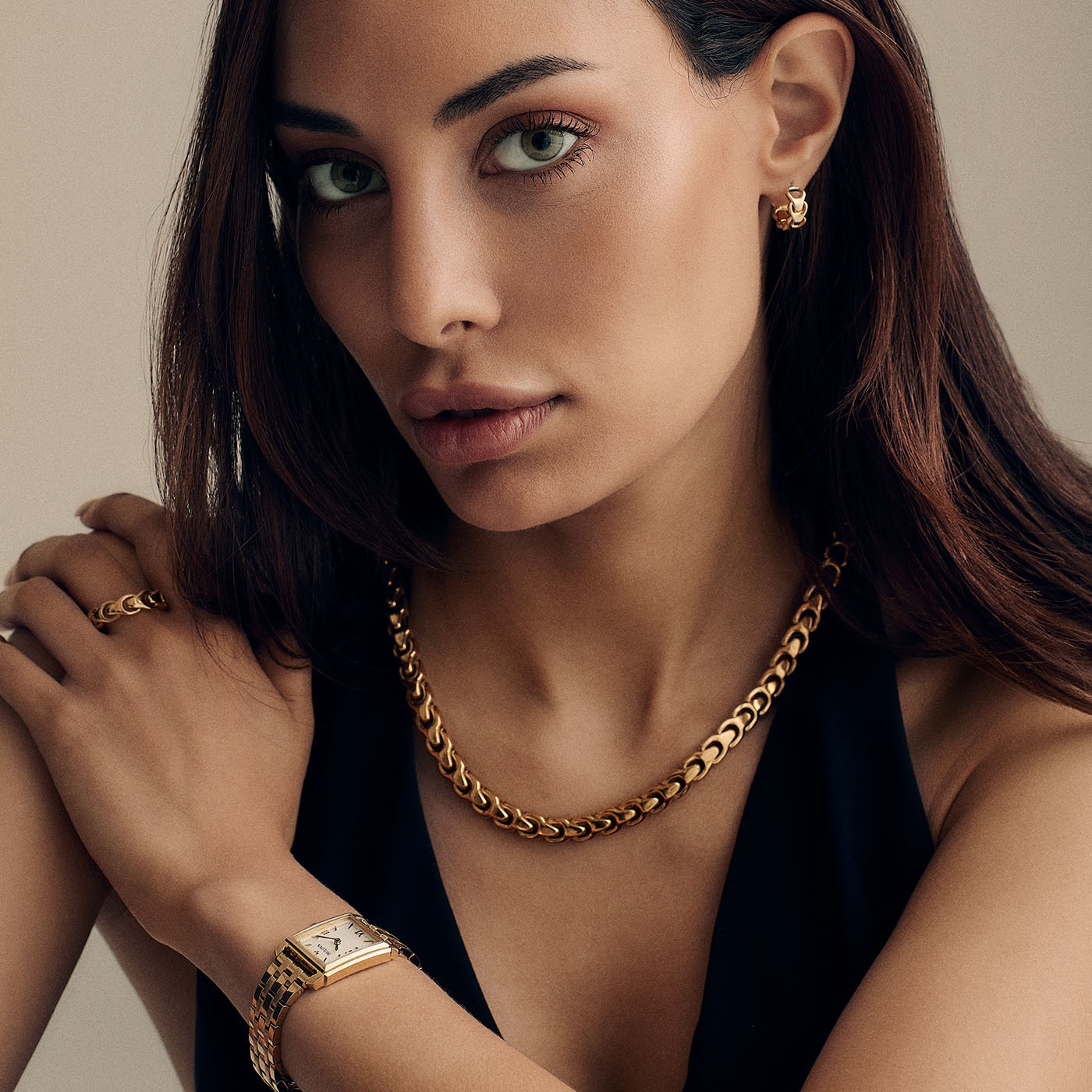 Die Armbanduhr verfügt über ein goldenes Gehäuse, aus Edelstahl gefertigt, das durch die Poliert, Mattierte Oberfläche wie ein echter Eyecatcher wirkt.