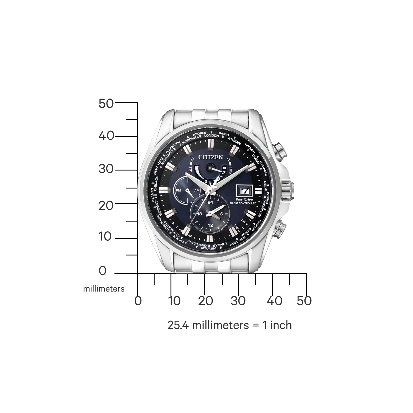 Die Citizen AT9030-55L ist eine elegante Herren-Funkuhr mit Eco-Drive-Antrieb (Solar) und 180 Tagen Gangreserve. Das 44 mm große, runde Edelstahlgehäuse sowie das massive Edelstahlarmband sind silberfarben, das Zifferblatt ist blau und durch entspiegeltes Saphirglas geschützt. Die Uhr bietet Funksteuerung (EUR/JPY/USA/China), Weltzeit, ewigen Kalender mit Tag/Datum, 24-Stunden-Anzeige, täglichen Alarm sowie Anzeige der Energiereserve und Batterieladung. Sie ist bis 20 bar wasserdicht und damit auch für Schwimmen und Schnorcheln gut geeignet.