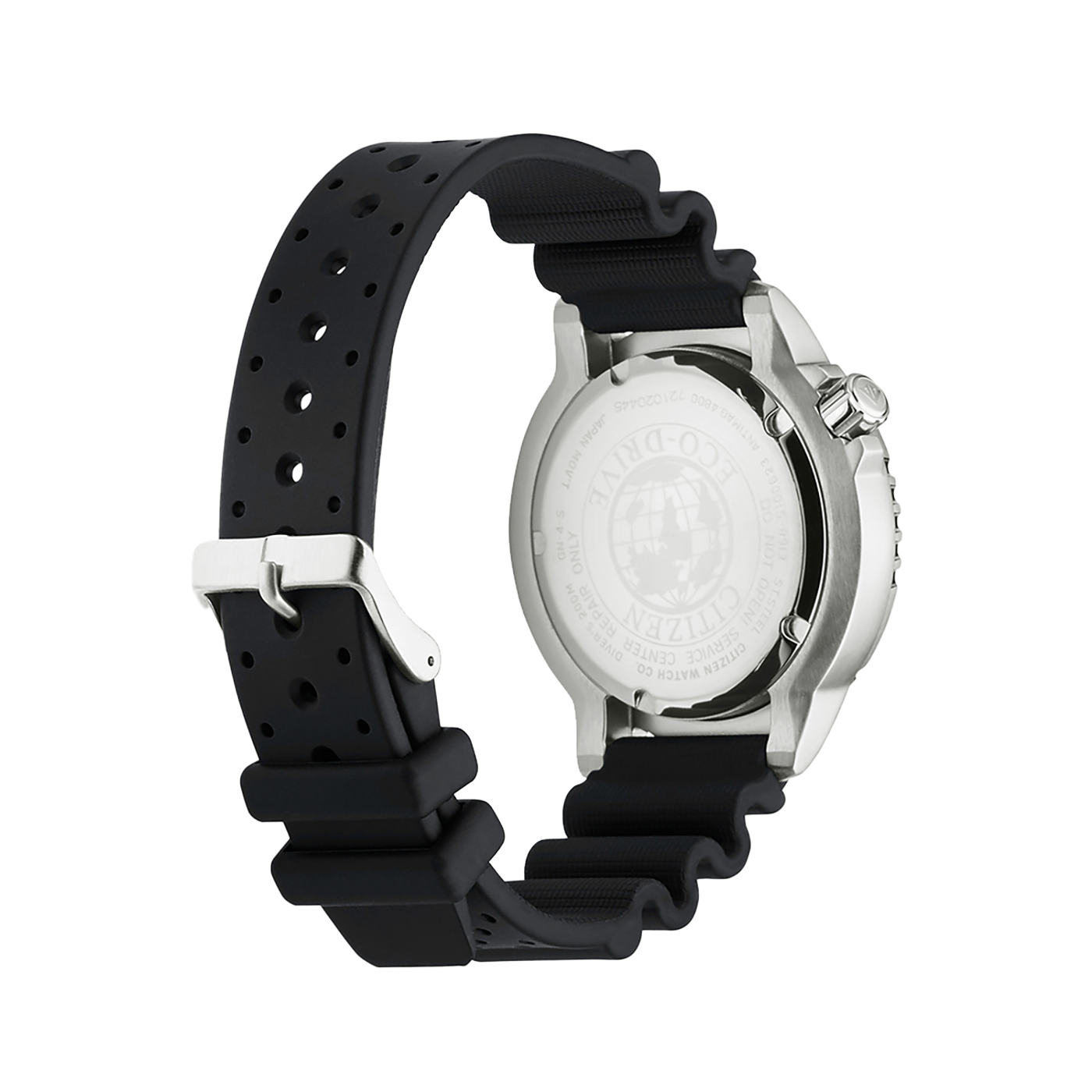 Beweisen Sie mit der ISO-zertifizierten Promaster Diver von CITIZEN®, dass eine Taucheruhr Spaß machen und funktional sein kann. Dank der Eco-Drive-Technologie wird sie durch Licht angetrieben und benötigt keine Batterie, sodass Sie nie wieder Ihren Gehäuseboden öffnen oder Ihren Tauchgang gefährden müssen. Ausgestattet mit Edelstahlgehäuse, dunkelblauem Polyurethanband und dunkelblauem Zifferblatt. Mit Aluminiumring auf der Lünette, einseitig drehbarer Zeitanzeige und WR200. Ausgestattet mit unserer Eco-Drive Technologie – angetrieben durch Licht, jedes Licht. Benötigt nie eine Batterie. Kaliber Nummer E168