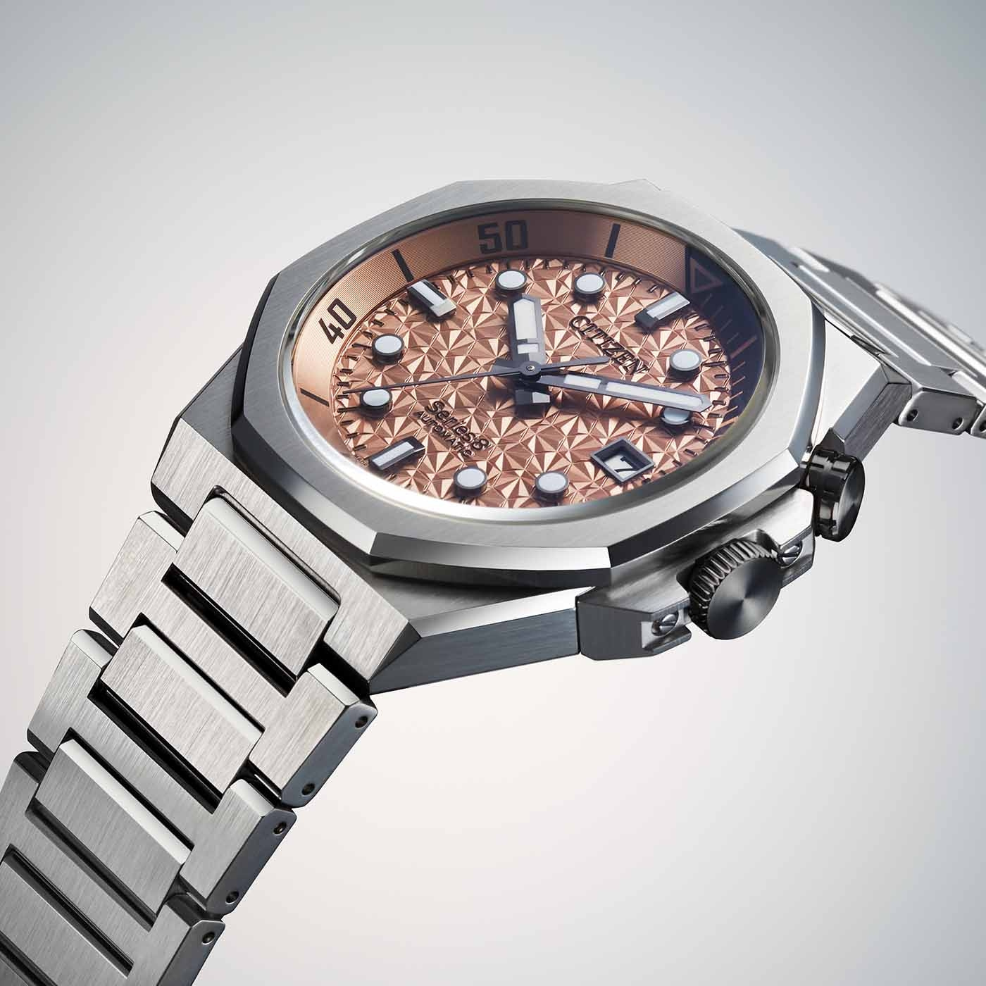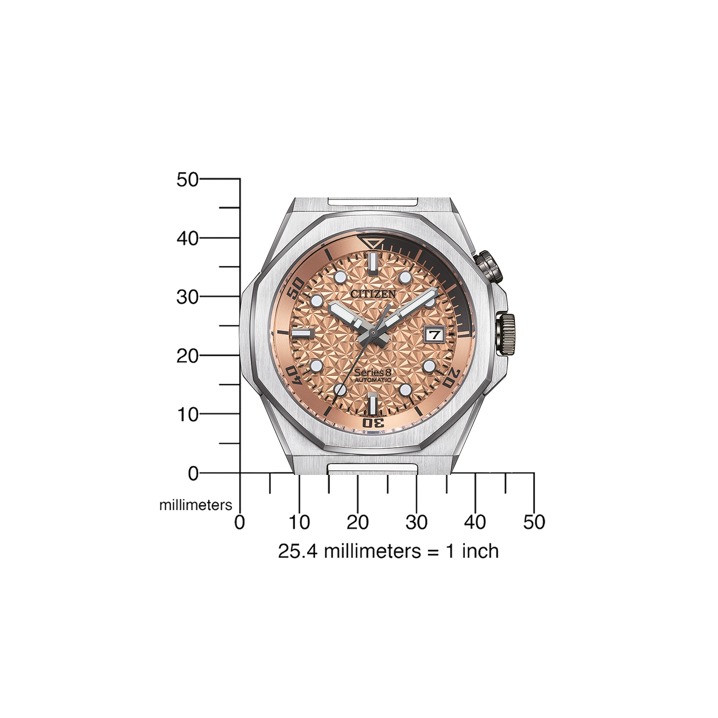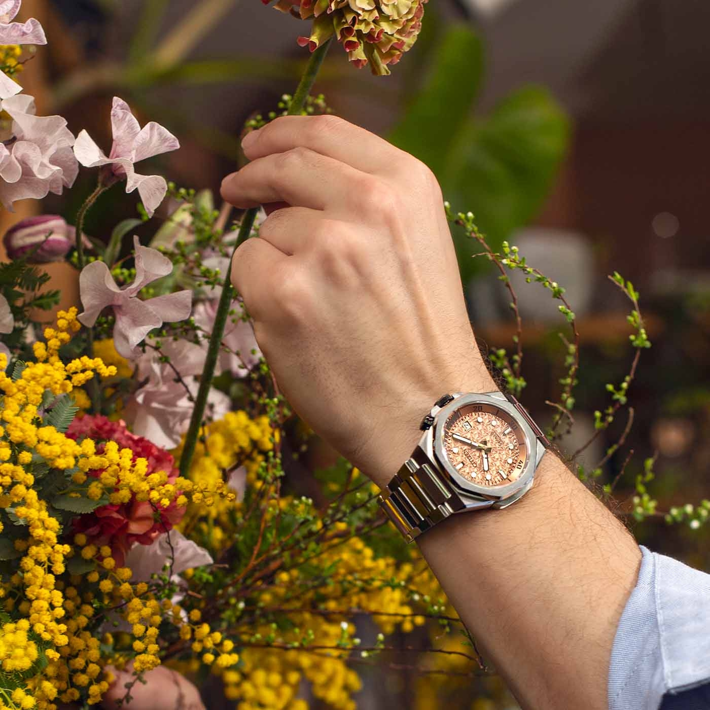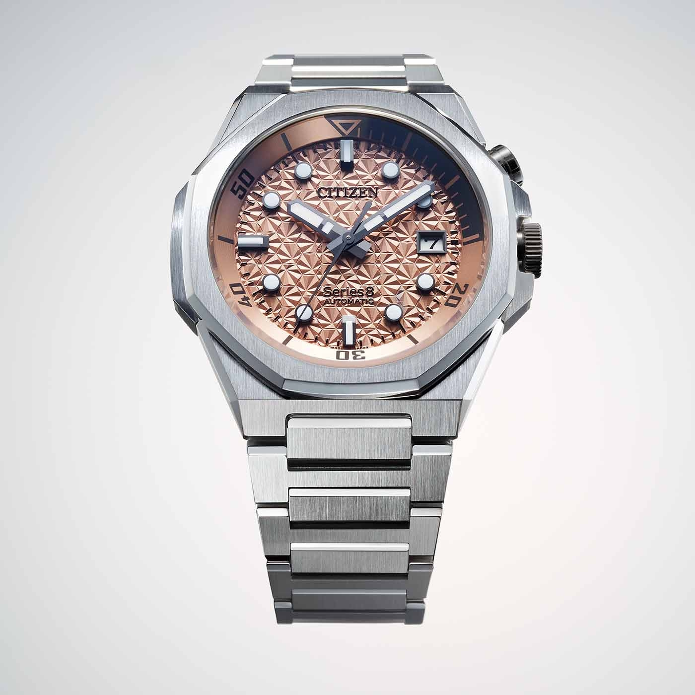 Das kantige Design der bidirektionalen Innen-Lünette verleiht der Uhr einen noch sportlicheren Look. Das Zifferblatt dieser limitierten Auflage ist mit Kirschblüten in einem einzigartigen geometrischen Muster gestaltet. Die Farbe Kupferrosa sorgt für ein stilvolles, anspruchsvolles Aussehen, welches der visuellen Identität der Serie 8 Kollektion entspricht. Der transparente Gehäuseboden gibt den Blick auf das tickende Herz der Uhr frei. Das Uhrwerk ist zudem mit einer Magnetresistenz ausgestattet, um die Genauigkeit der Uhr zu erhalten, indem es die Auswirkungen von Magnetfeldern reduziert, die von Smartphones und Tablets in unserer digitalen Gesellschaft erzeugt werden. Zu den besonderen Merkmalen gehören eine durchschnittliche Tagesgenauigkeit von -10 bis +20 Sekunden und eine Gangdauer von ca. 42 Stunden.