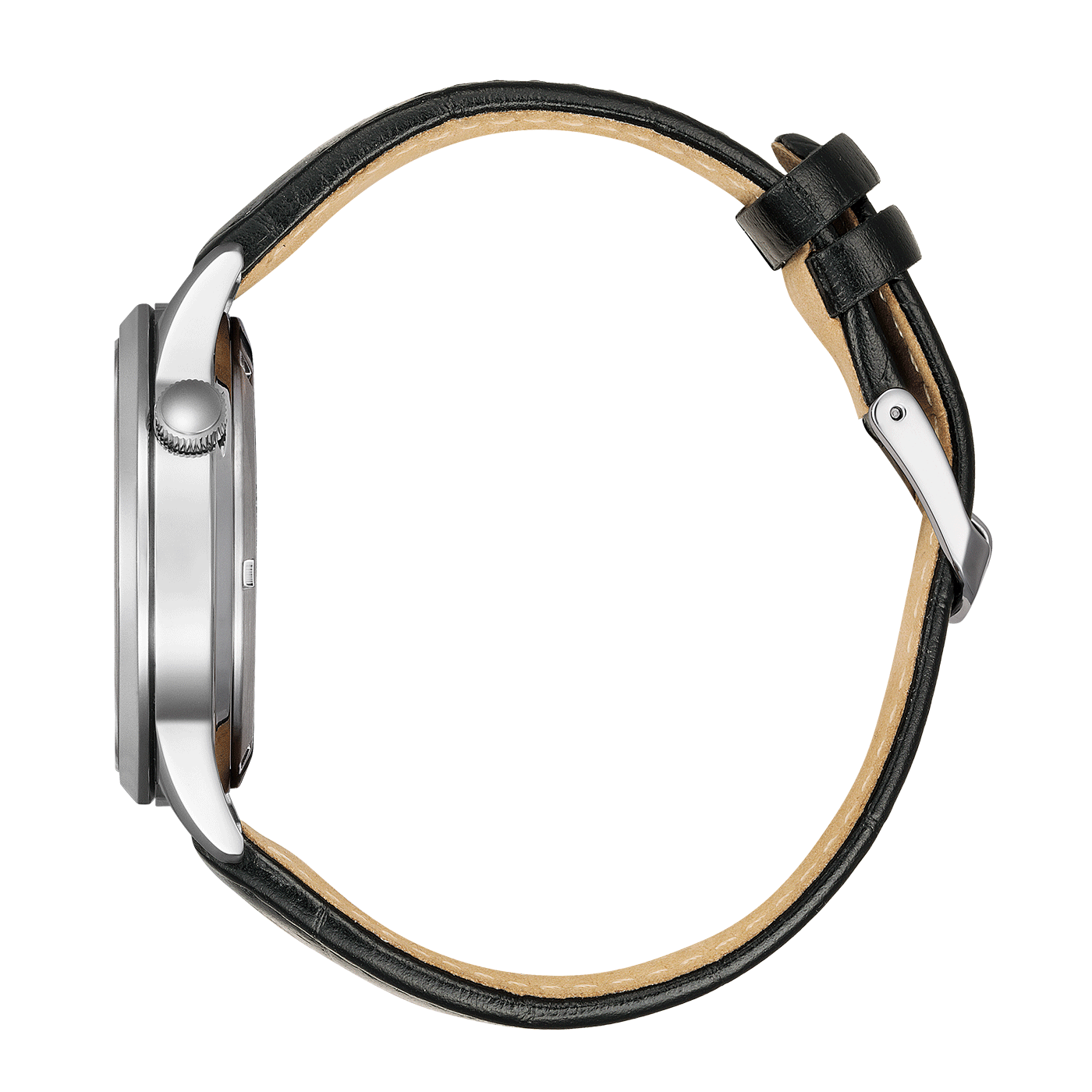 Das schwarze Zifferblatt mit feiner Struktur, arabischen Ziffern und Strichindizes wird durch robustes Kristallglas geschützt. Im Inneren arbeitet das mechanische Kaliber 8229 mit einer Gangreserve von 42 Stunden und einer Genauigkeit von ±20 Sekunden pro Tag. Mit 5 bar Wasserdichtigkeit eignet sich die Uhr ideal für den stilvollen Alltag.