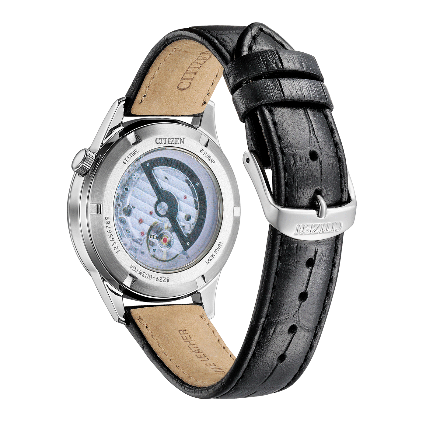 Die Citizen NH9131-14E ist eine klassische Herren-Automatik­uhr mit edler Optik und offener Unruh (Open Heart). Sie besitzt ein silberfarbenes Edelstahlgehäuse mit 40 mm Durchmesser sowie ein leichtes, schwarzes Lederarmband für hohen Tragekomfort.