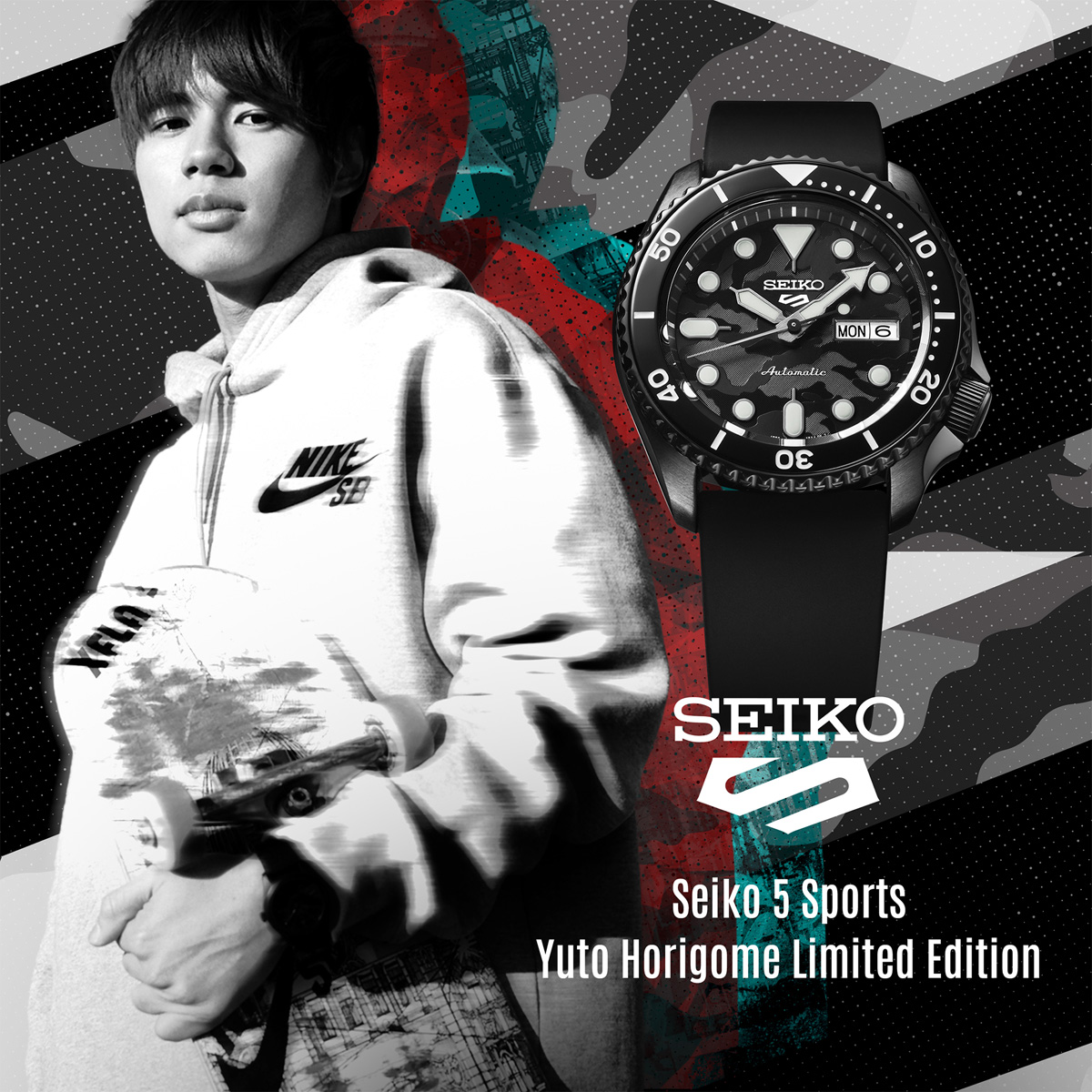 Die Seiko 5 SRPJ39K1 ist eine Special Edition zu Ehren von Yuto Horigome, dem Weltmeister im Skateboarden. Sie hat ein schwarzes Silikonarmband und ein Gehäuse aus Edelstahl mit Titanbeschichtung.