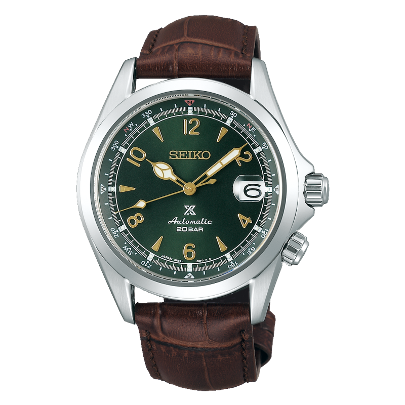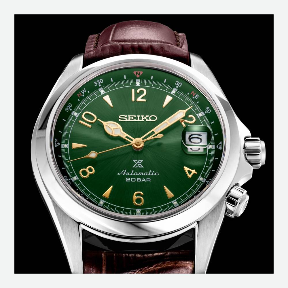 Die ikonische Seiko „Alpinist“ wurde 2020 in die Prospex-Kollektion aufgenommen. Sie trägt das X-Logo auf dem Zifferblatt, bewahrt aber ihren unnachahmlichen Chic und das Vintage-Design. Diese Automatikuhr verfügt über die emblematische Farbkombination mit Grün auf dem hellen Zifferblatt und Gold auf den Zeigern, Indizes und Ziffern. Diese Prospex-Uhr hat eine Wasserdichtigkeit von 20 bar und ist an einem braunen Lederarmband befestigt, das die Farben des Zifferblatts perfekt hervorhebt.