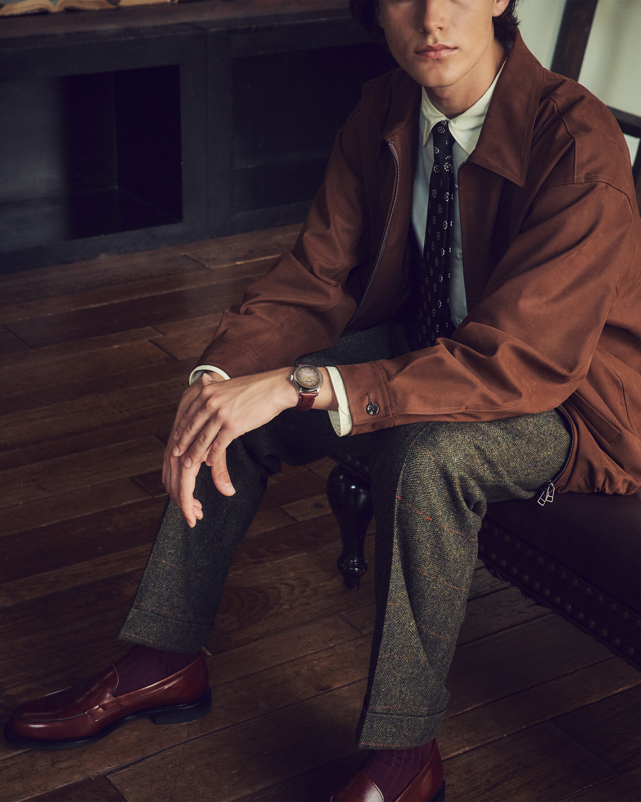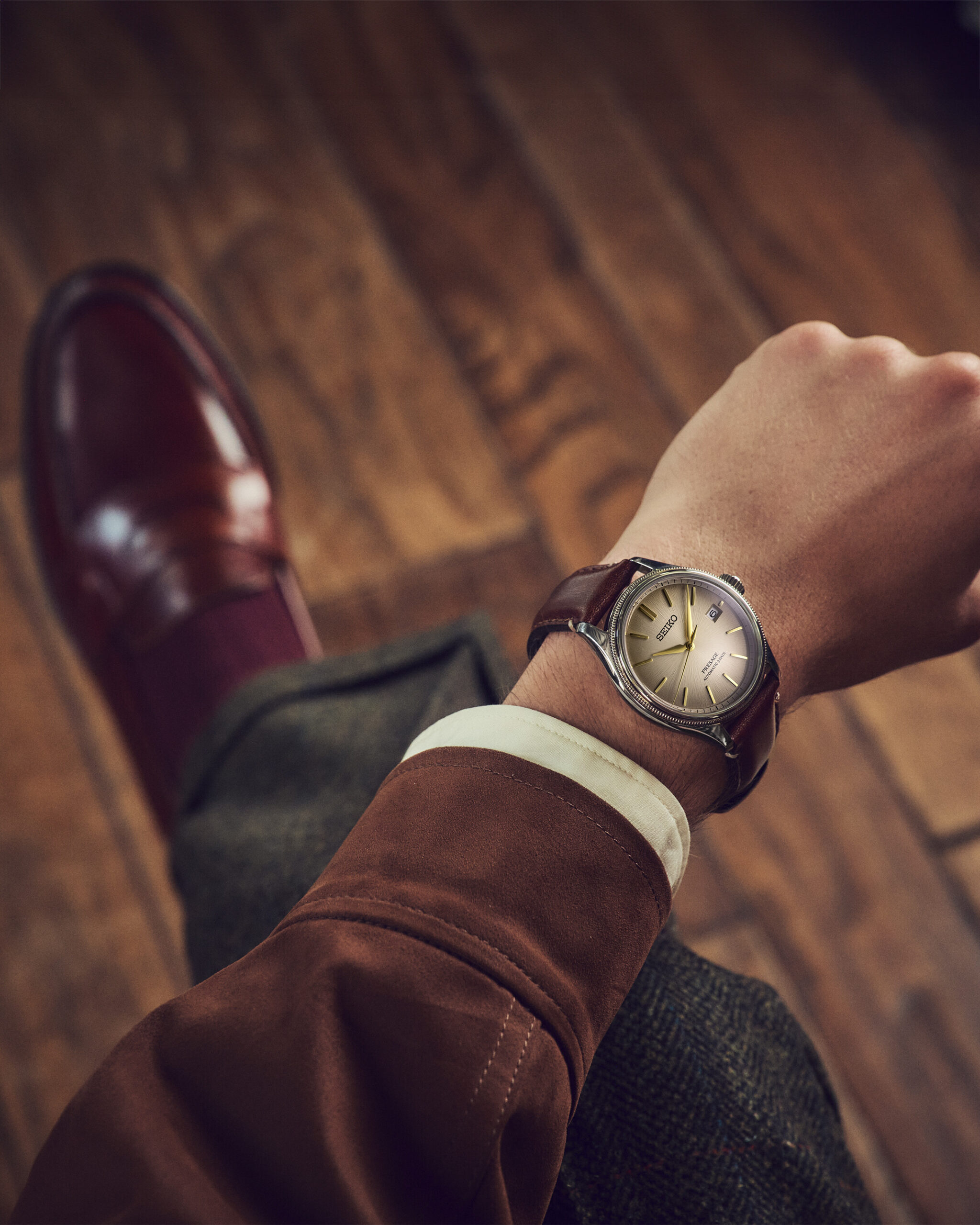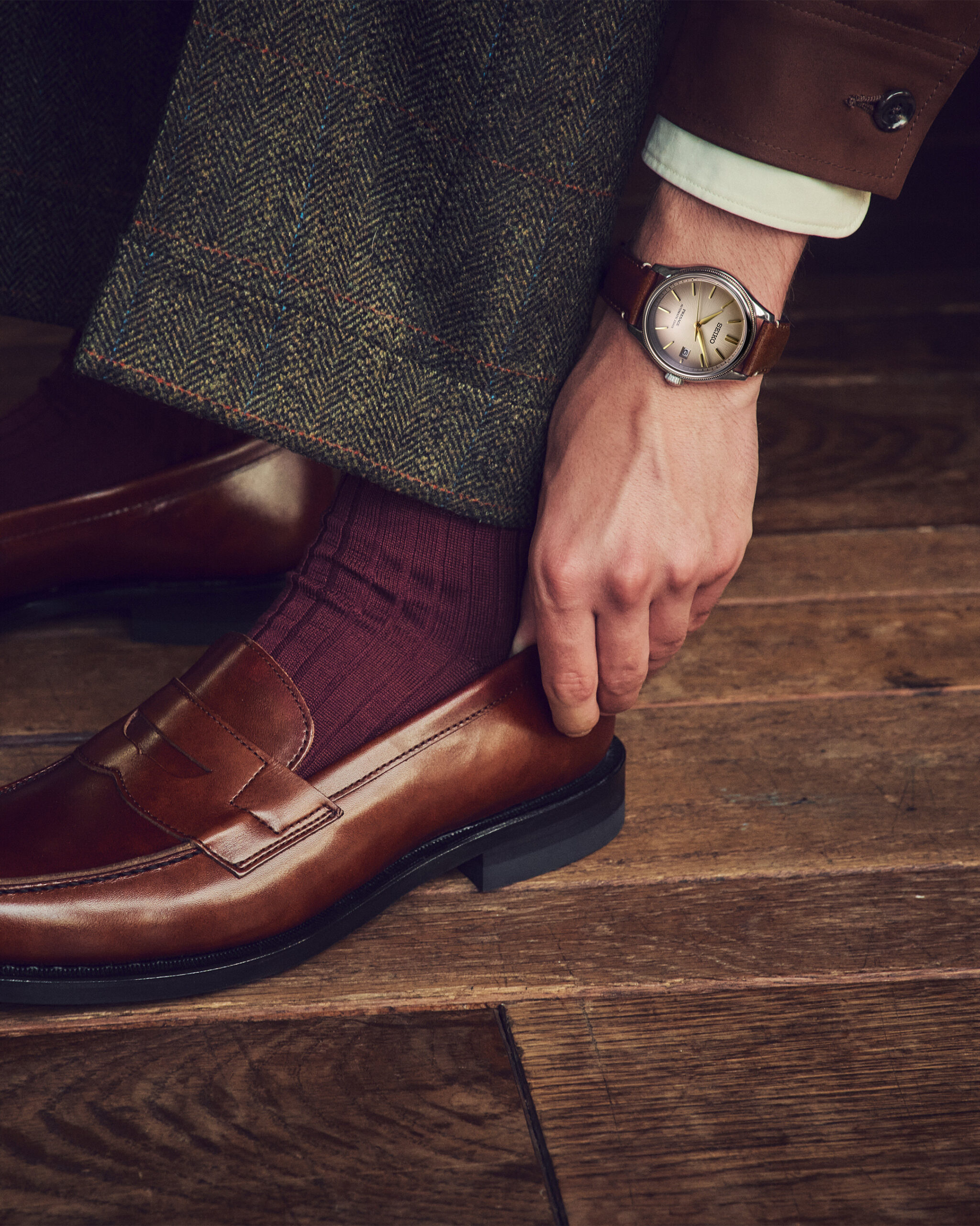 Dieses Modell bringt das Konzept der Classic Series auf besonders authentische Weise zum Ausdruck. Das Zifferblatt kombiniert den historischen Farbton Shiracha, der bereits in der Edo-Zeit geschätzt wurde, mit einem rauchigen Farbverlauf. Die Farbgestaltung erinnert an die natürliche Alterung edler Materialien und erzeugt ein spannendes Spiel aus Tiefe, Nuance und Charakter. Während das Edelstahl-Gehäuse hochglanzpoliert ist, wurde die Lünette durch eine braune Ion-Beschichtung veredelt. Diese sorgt für einen warmen Vintage-Ton mit hochwertigem Finish. Das Lederarmband wird in Zusammenarbeit mit einem renommierten japanischen Schuhhersteller gefertigt. Verwendet werden hochwertige Lederreste, die in der Schuhproduktion übrigbleiben. So entsteht aus scheinbar Unbrauchbarem etwas Neues mit Wert. Ein klares Zeichen für einen bewussten Umgang mit Ressourcen und ein durchdachtes Design. Die Innenseite des Bands besteht aus dem gleichen Material wie das Futter der Originalschuhe und sorgt für ein weiches, angenehmes Tragegefühl.